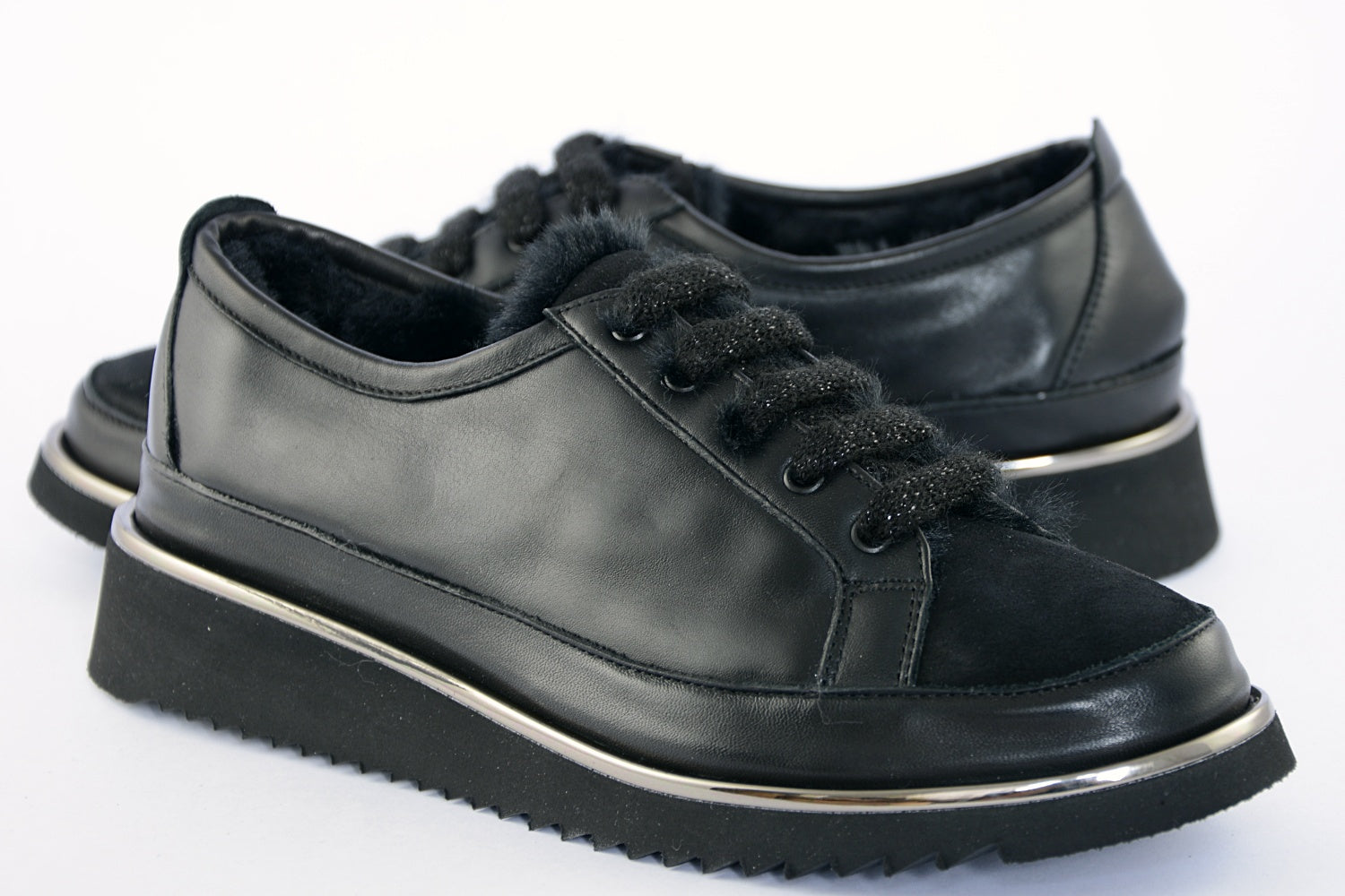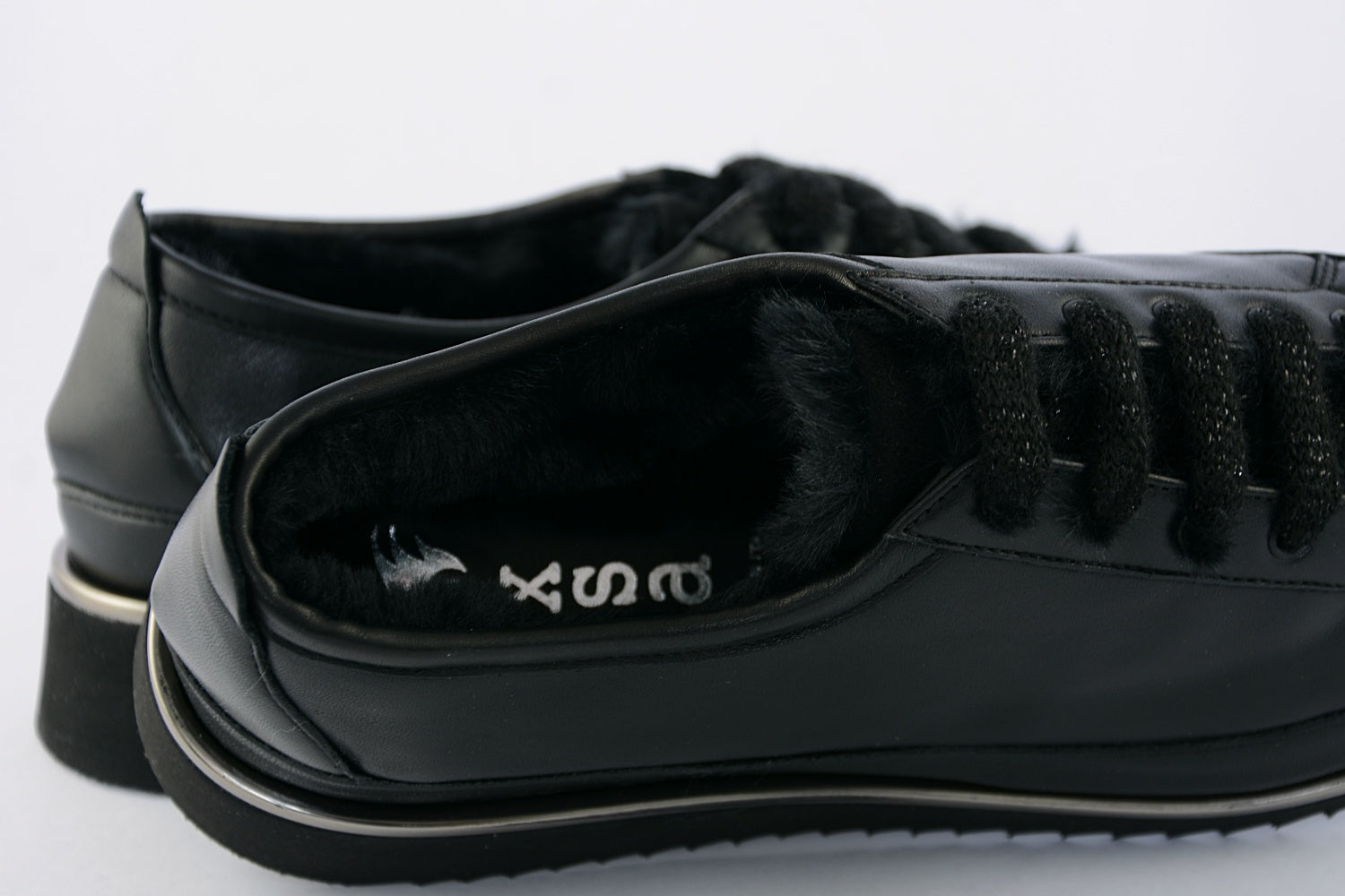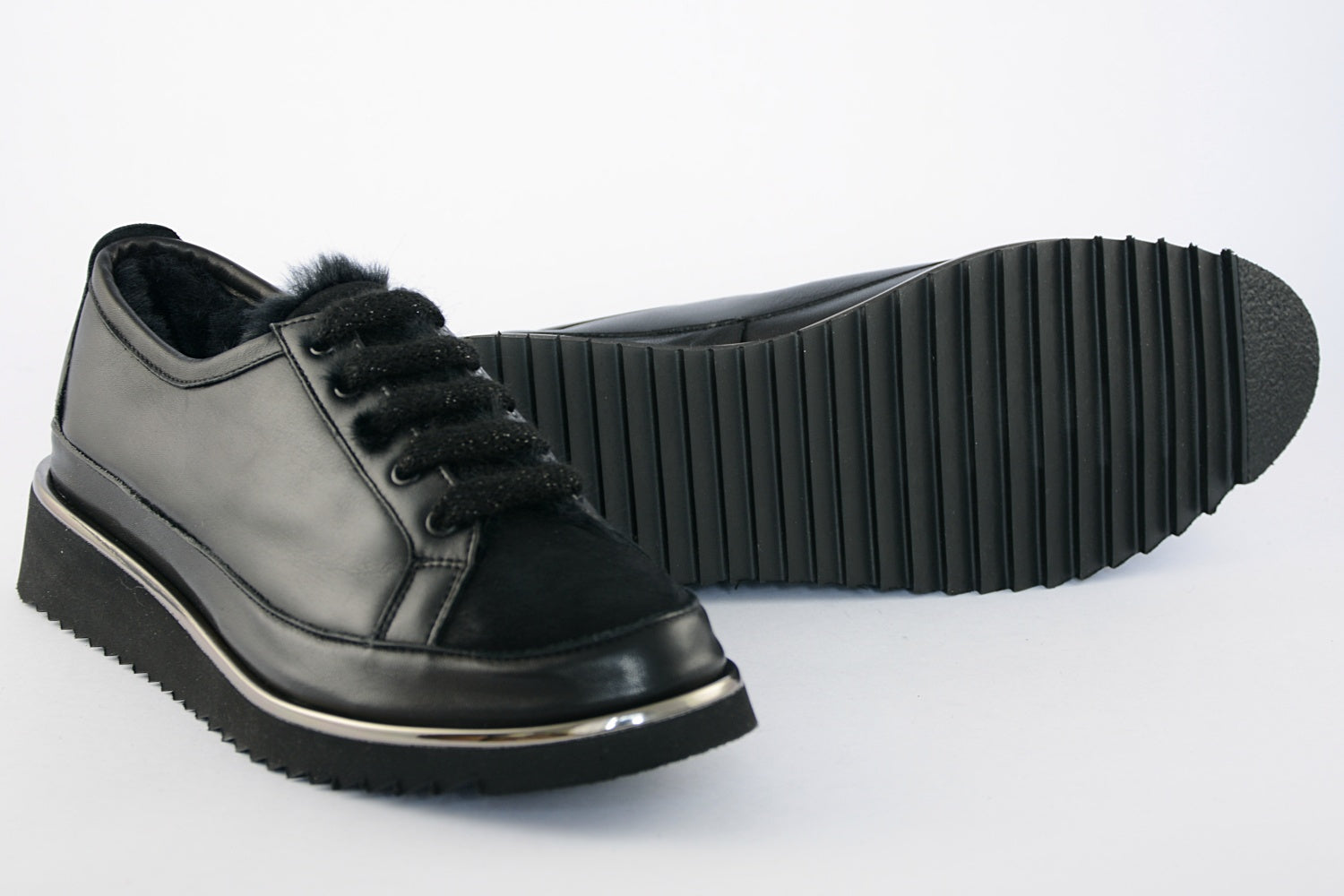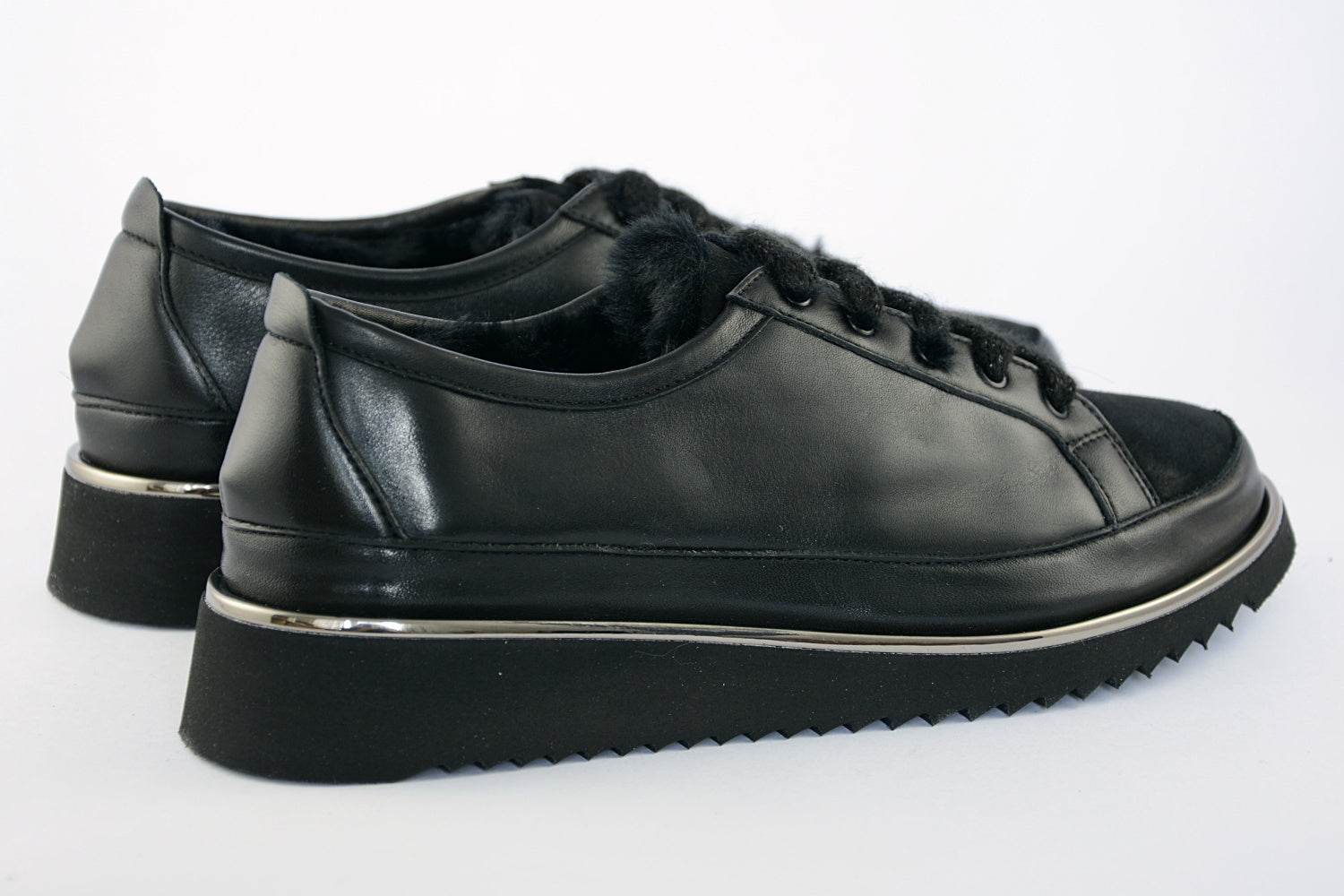 Alexandra 'Sofia' black leather trainers have a black suede toe and a fabulous sheepskin lining. They have black sparkly laces and a silver trim. Low silhouette on a low wedge and leather-lined.