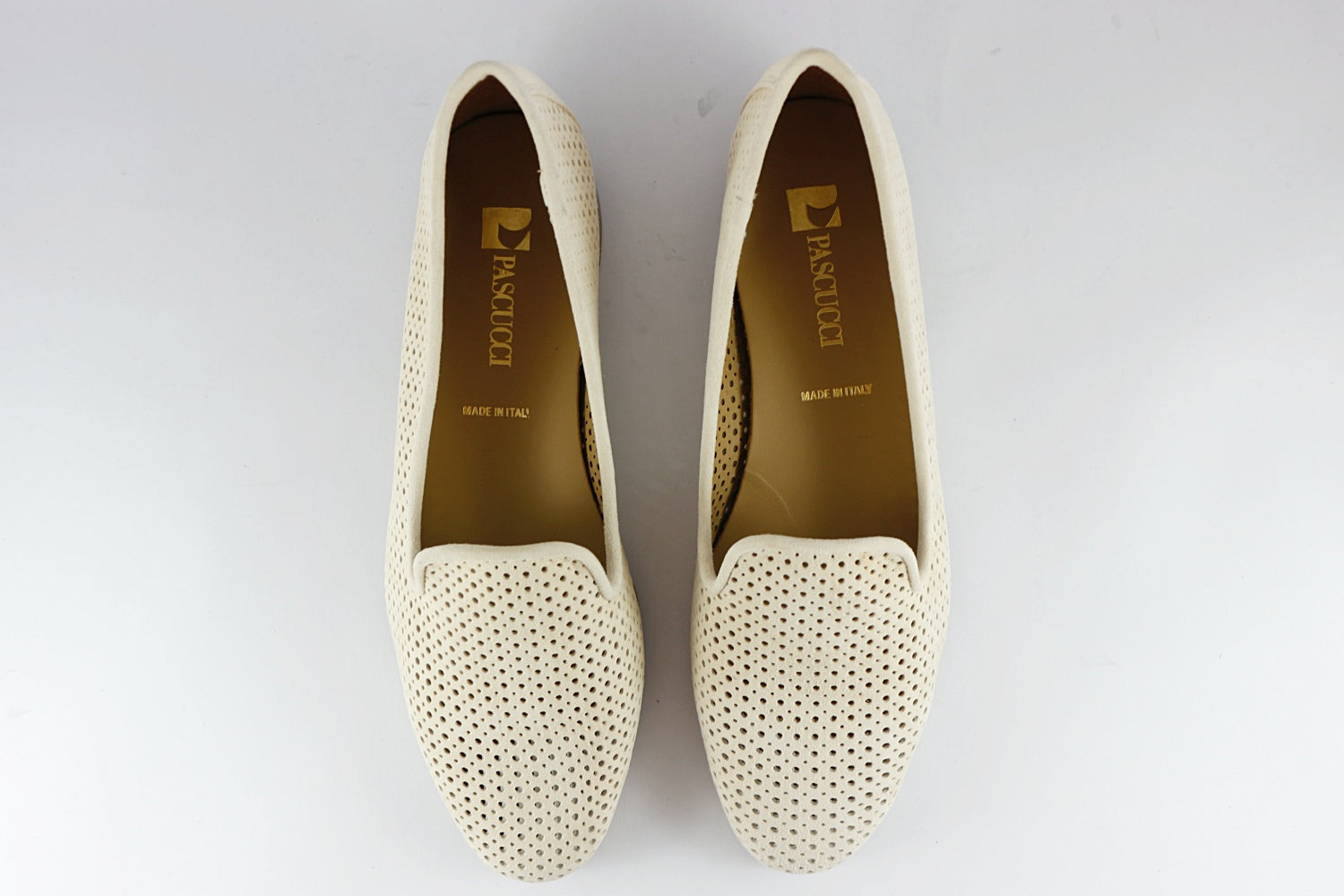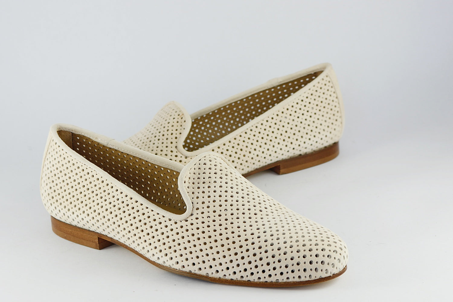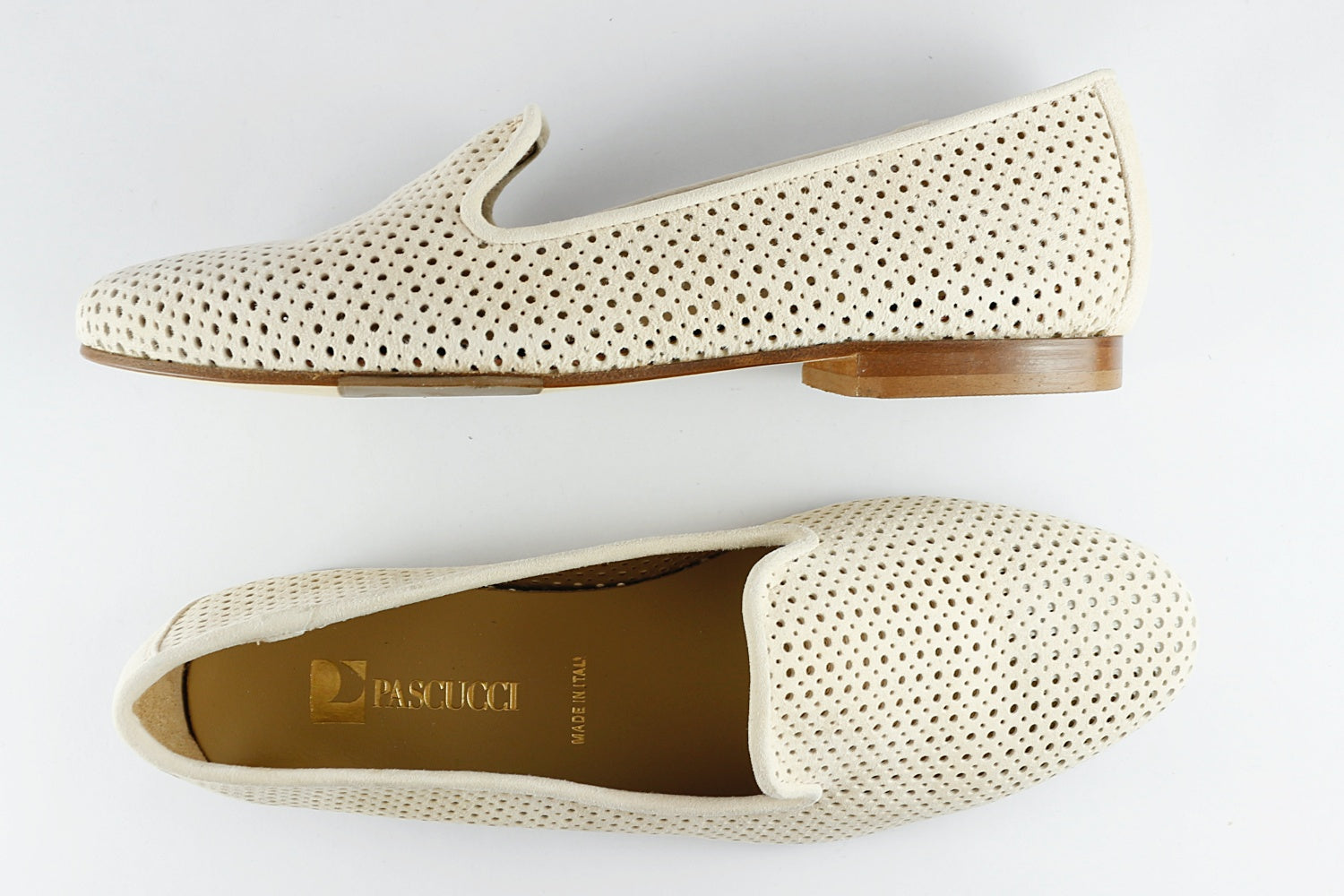 Our popular Pascucci suede loafer with punched holes in Almond, on a leather sole with a rubber non-slip panel. They are leather-lined.