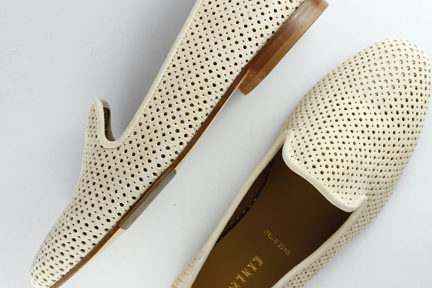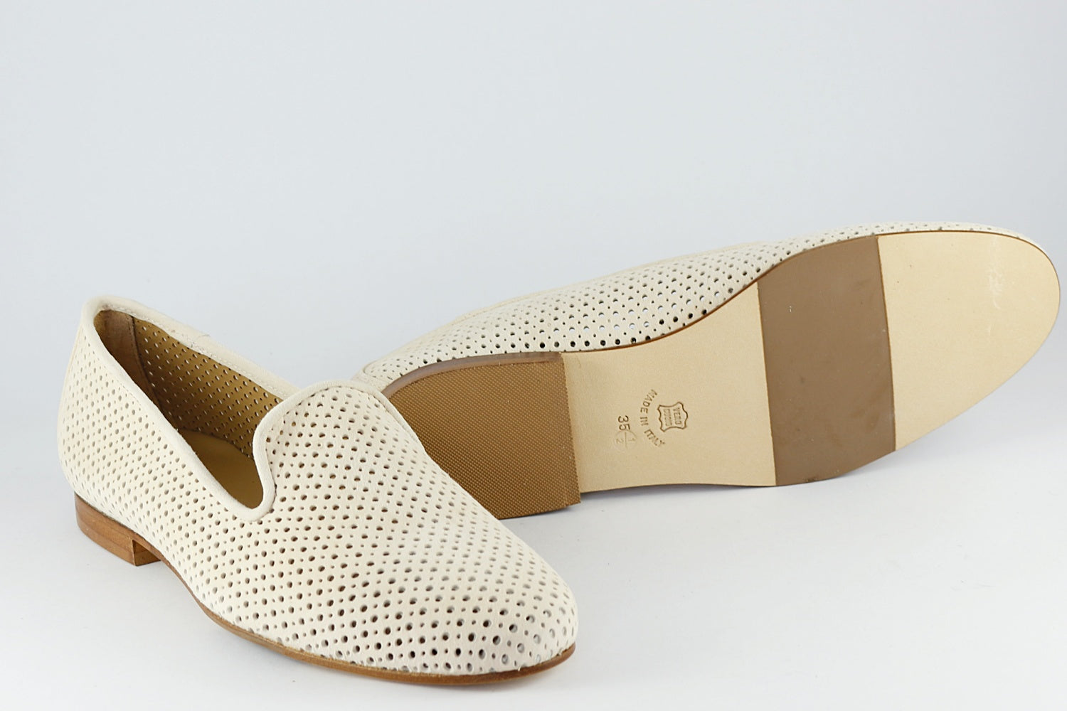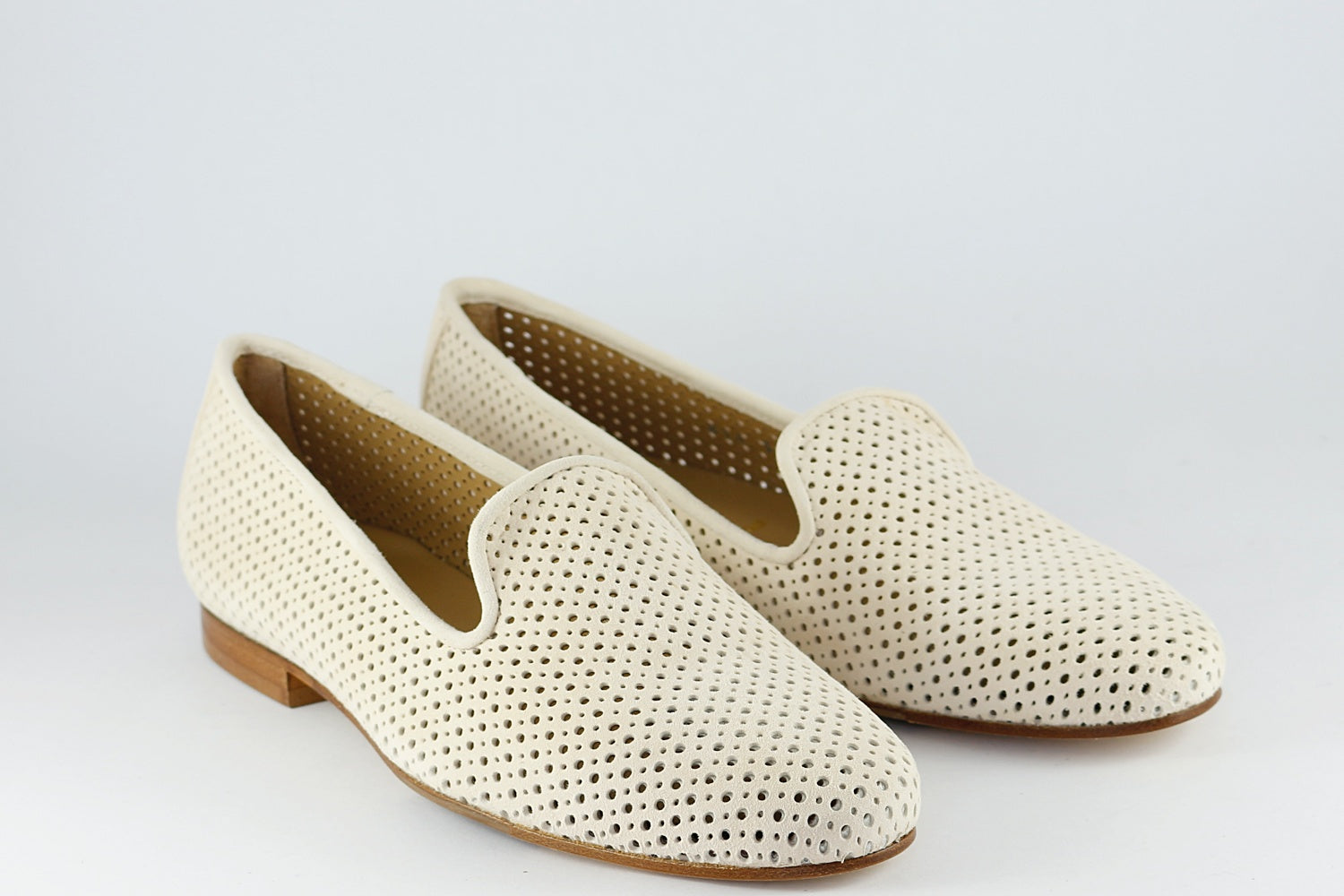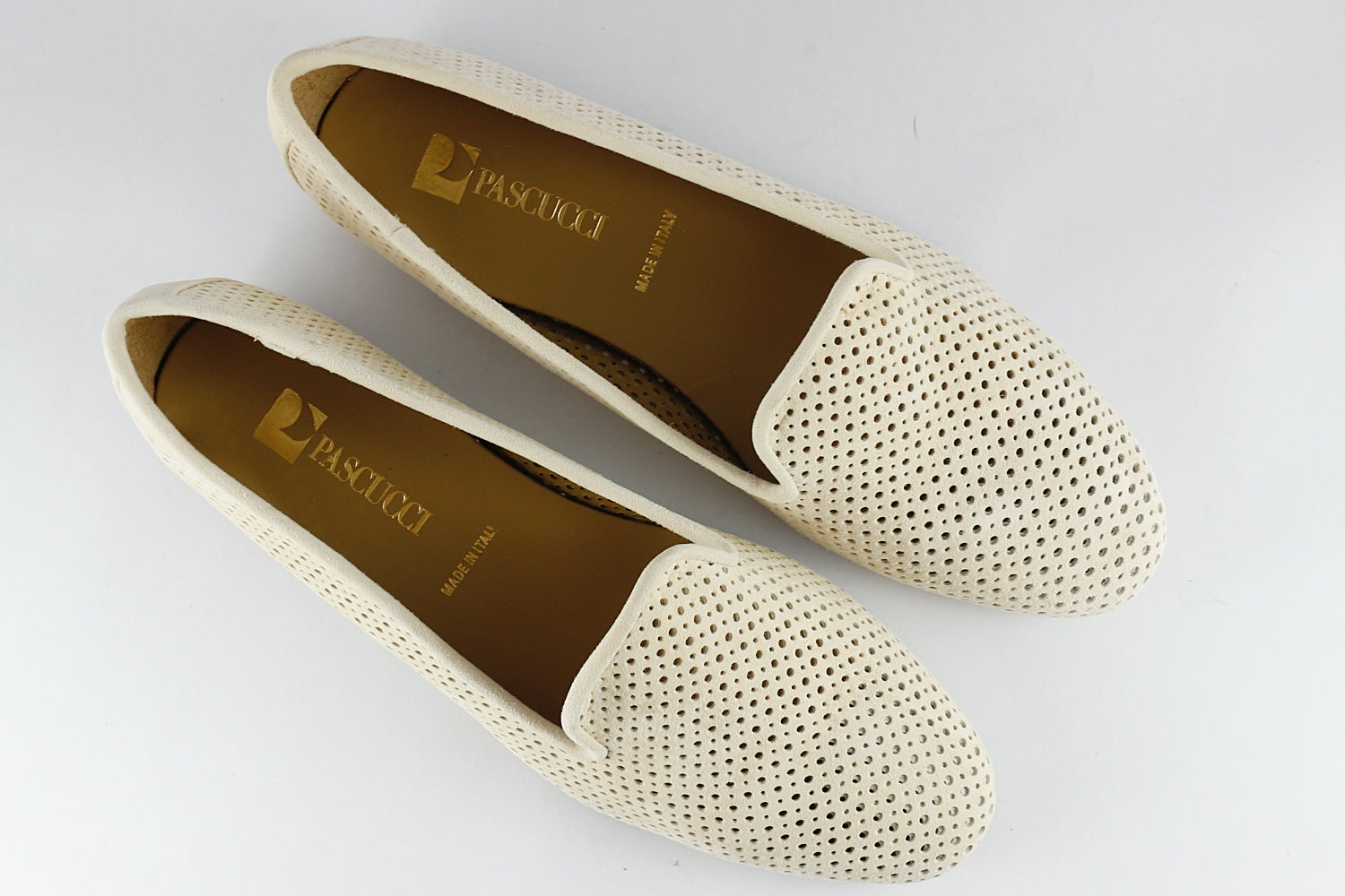 Our popular Pascucci suede loafer with punched holes in Almond, on a leather sole with a rubber non-slip panel. They are leather-lined.