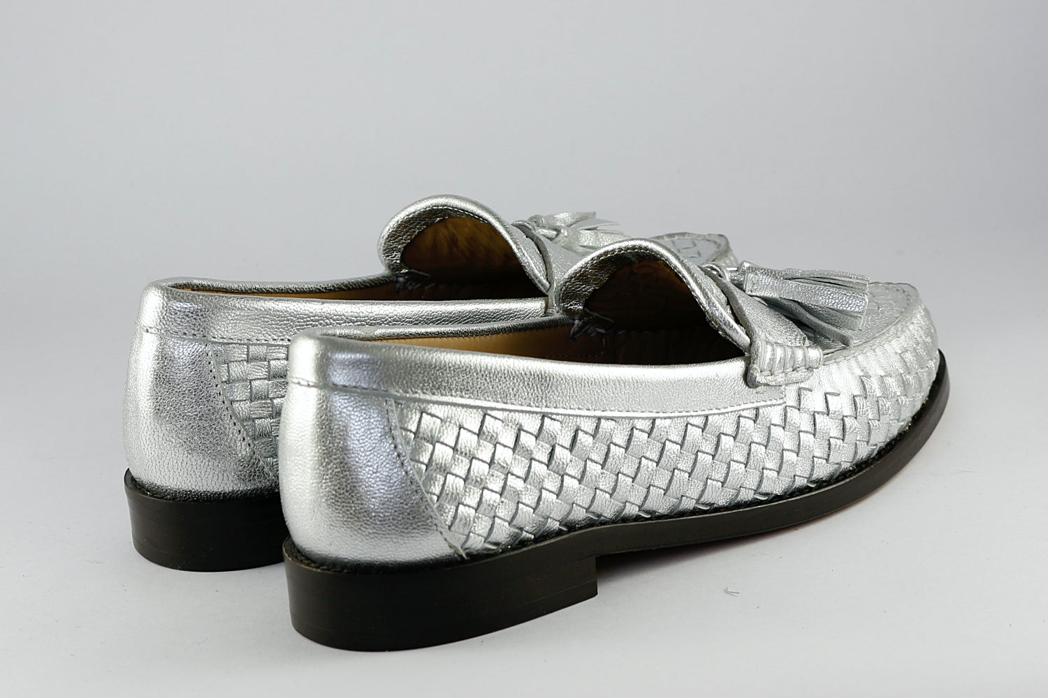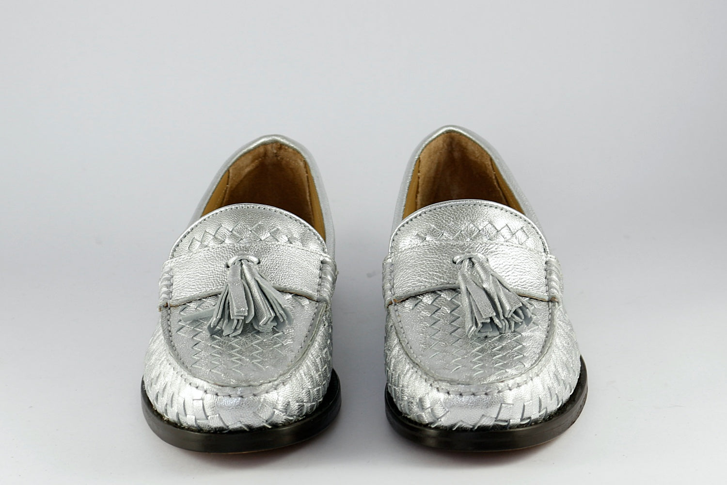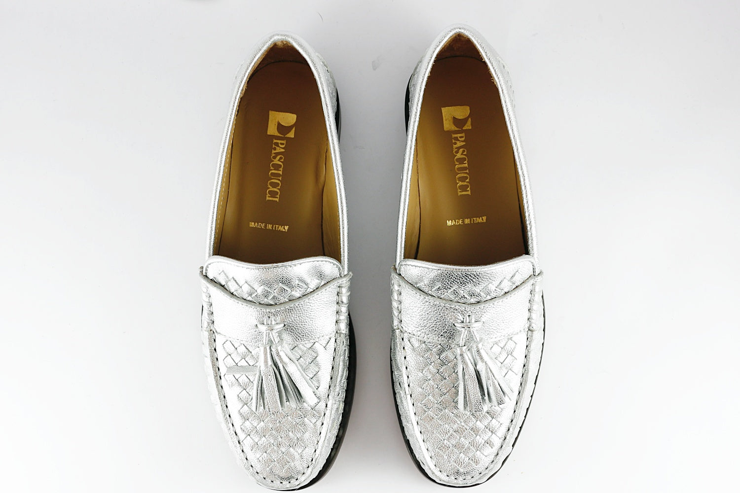 Pascucci's 'Lombardy' loafer comes in silver woven leather with a double tassel detail. The inners and sole are leather, with a rubber heel bottom.