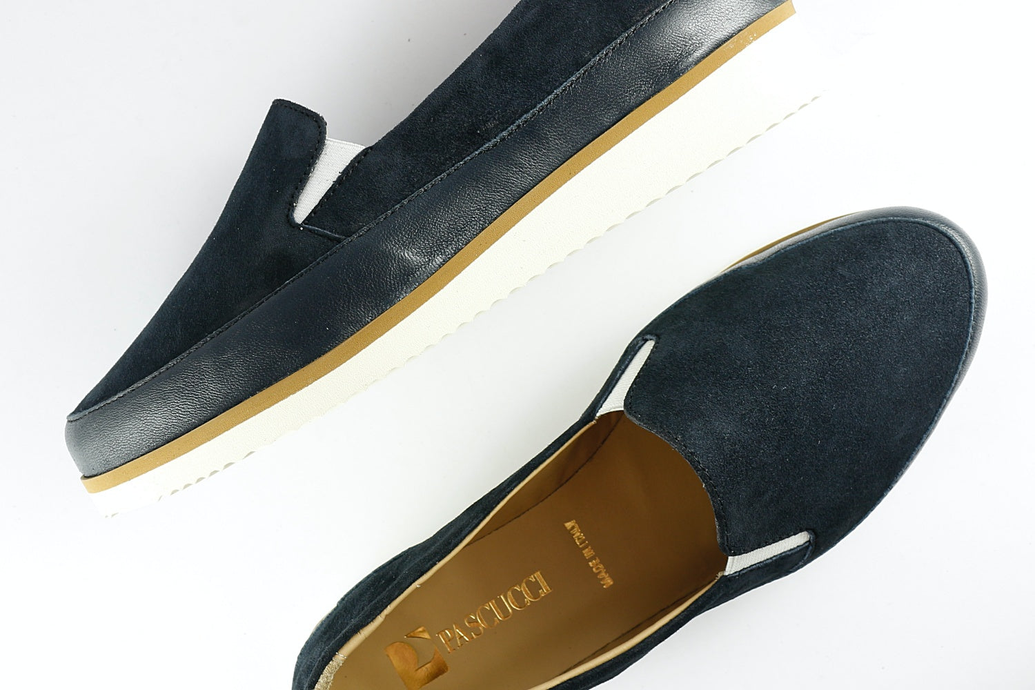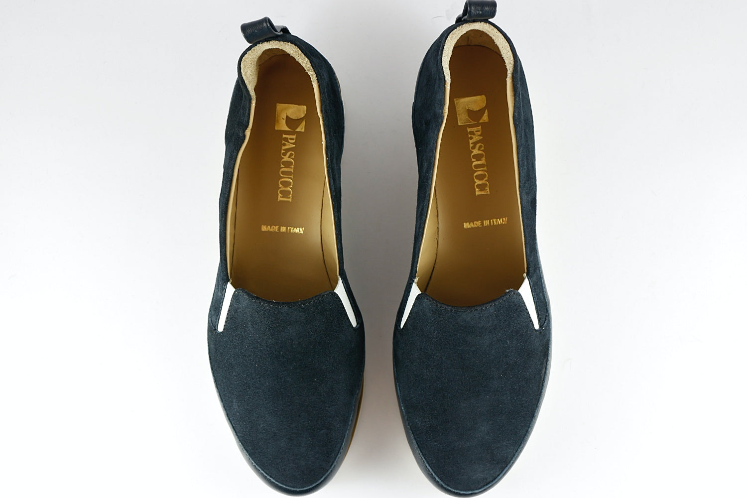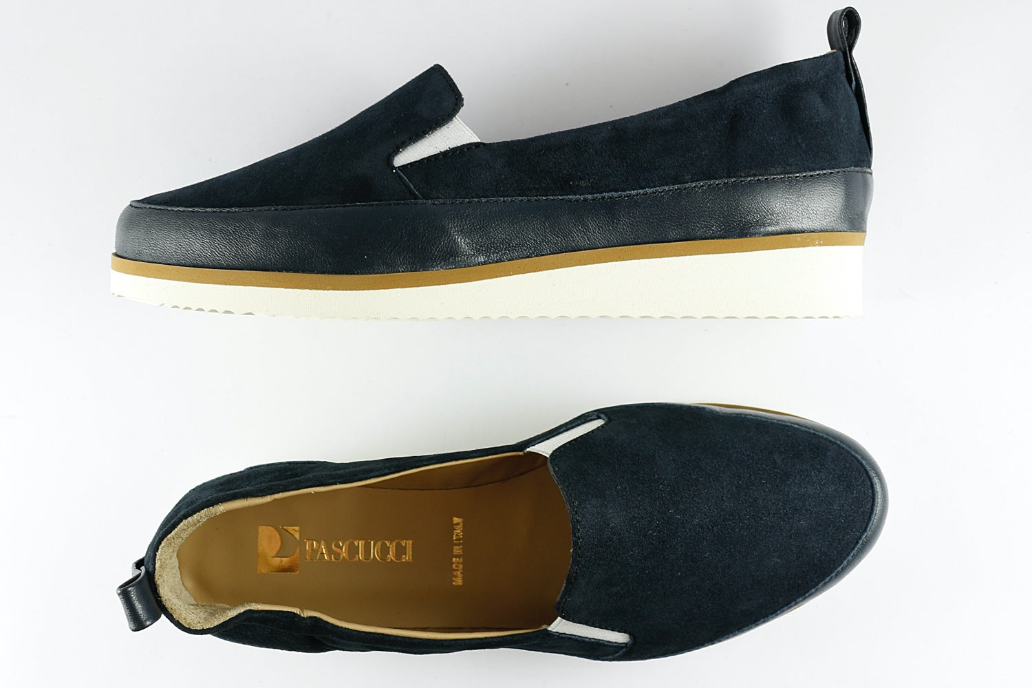 Pascucci 'Roma' suede shoe in Prussian Blue with a matching leather trim, on a slightly wedged white rubber sole (very lightweight). Leather-lined.
