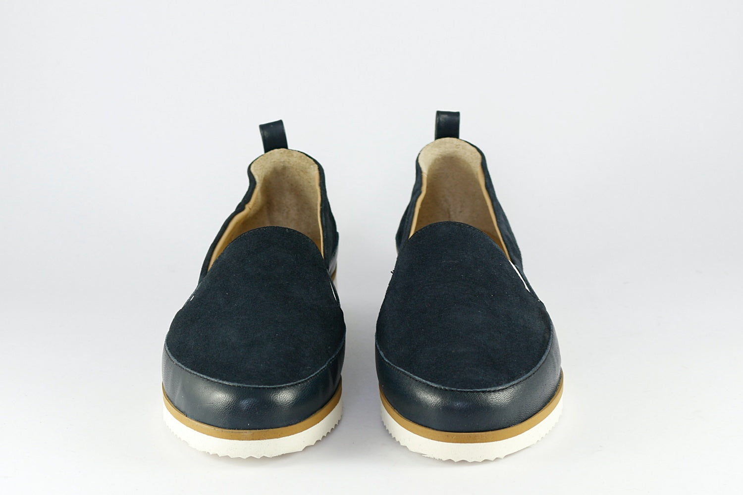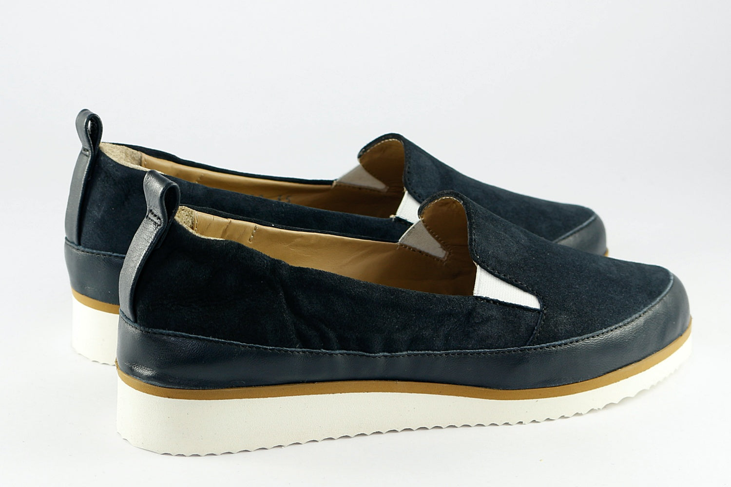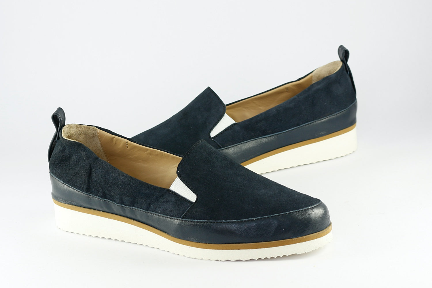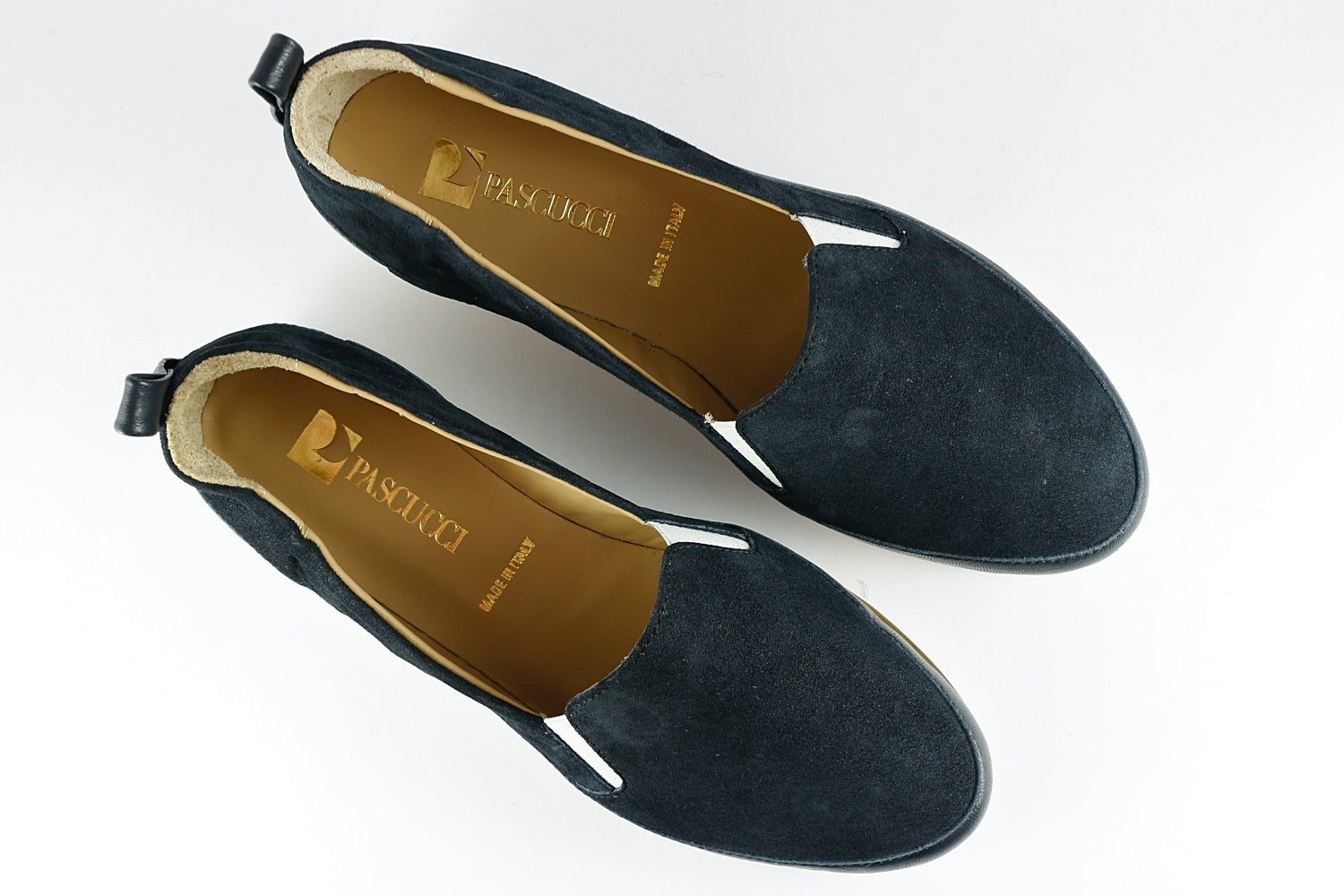 Pascucci 'Roma' suede shoe in Prussian Blue with a matching leather trim, on a slightly wedged white rubber sole (very lightweight). Leather-lined.