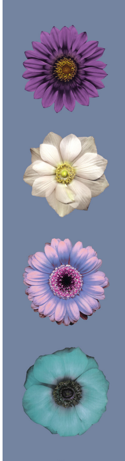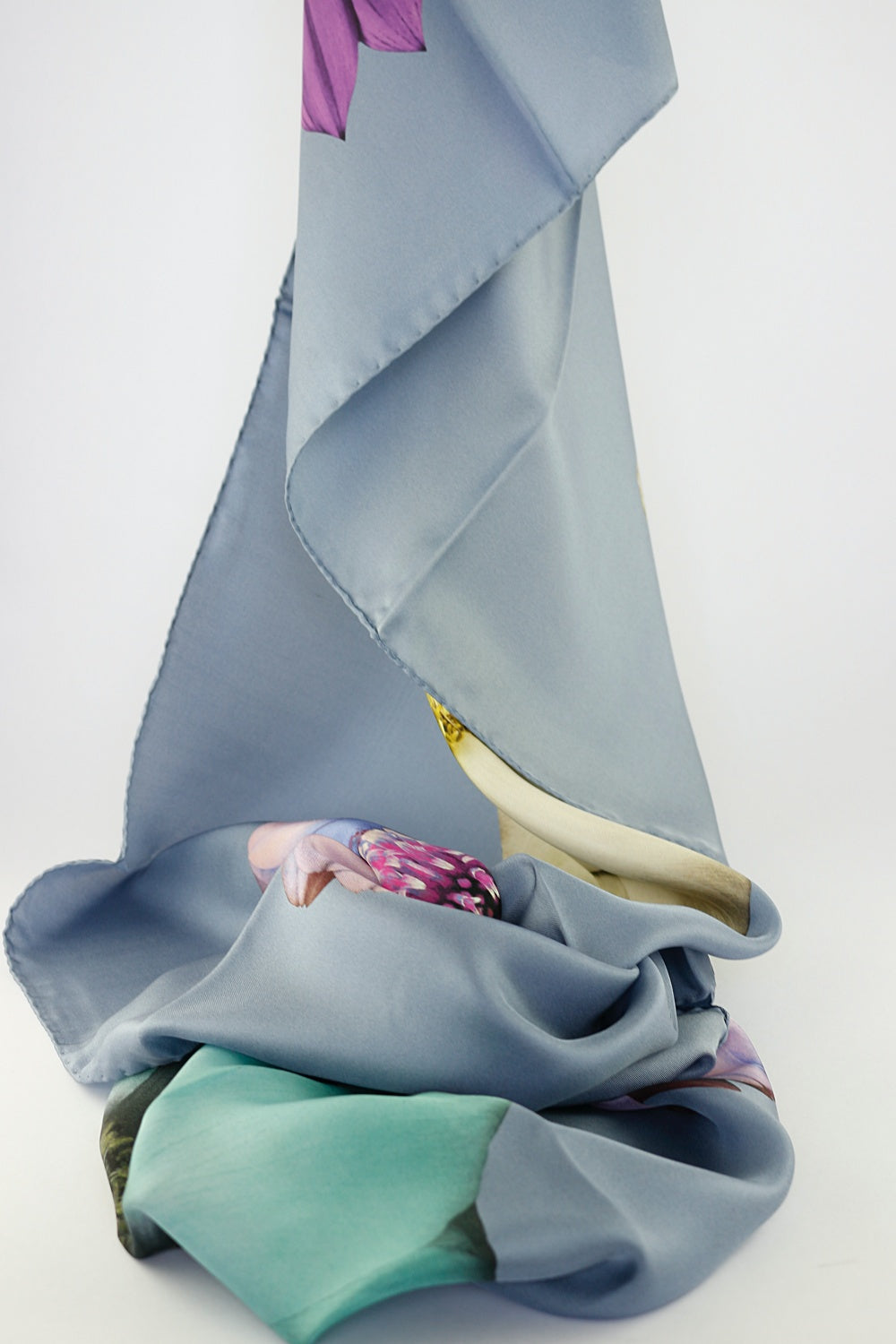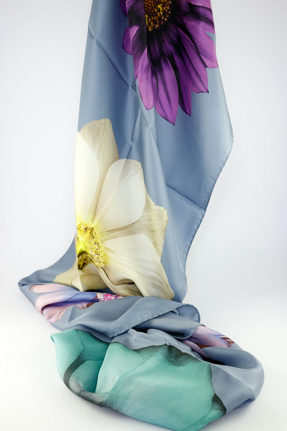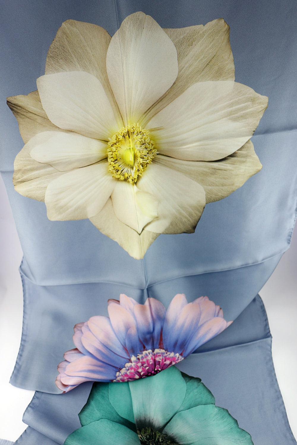 The Barbieri 'Luminous Flower' is a stunning silk twill oblong printed scarf. It has a Blue-Grey background with four large flowers in luminescent bright colours of green, pink, ivory and purple.