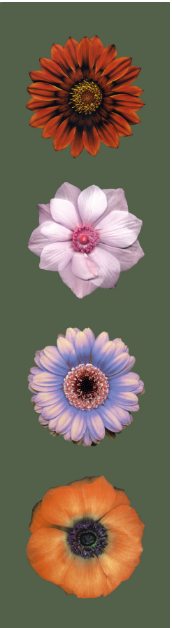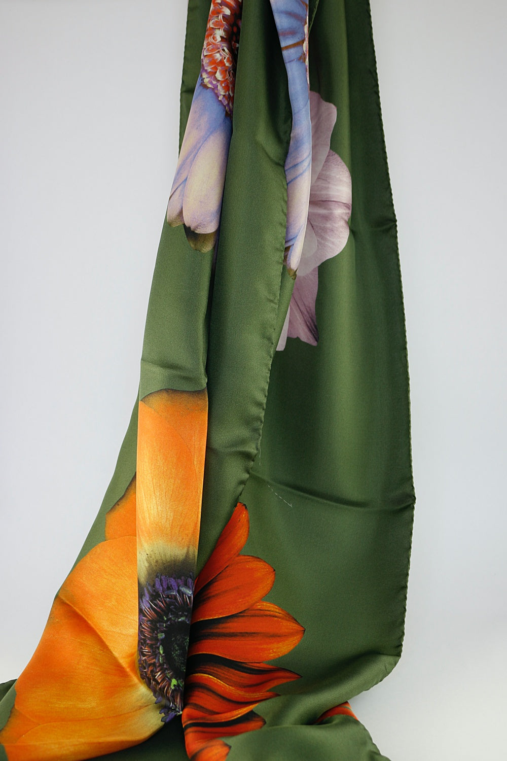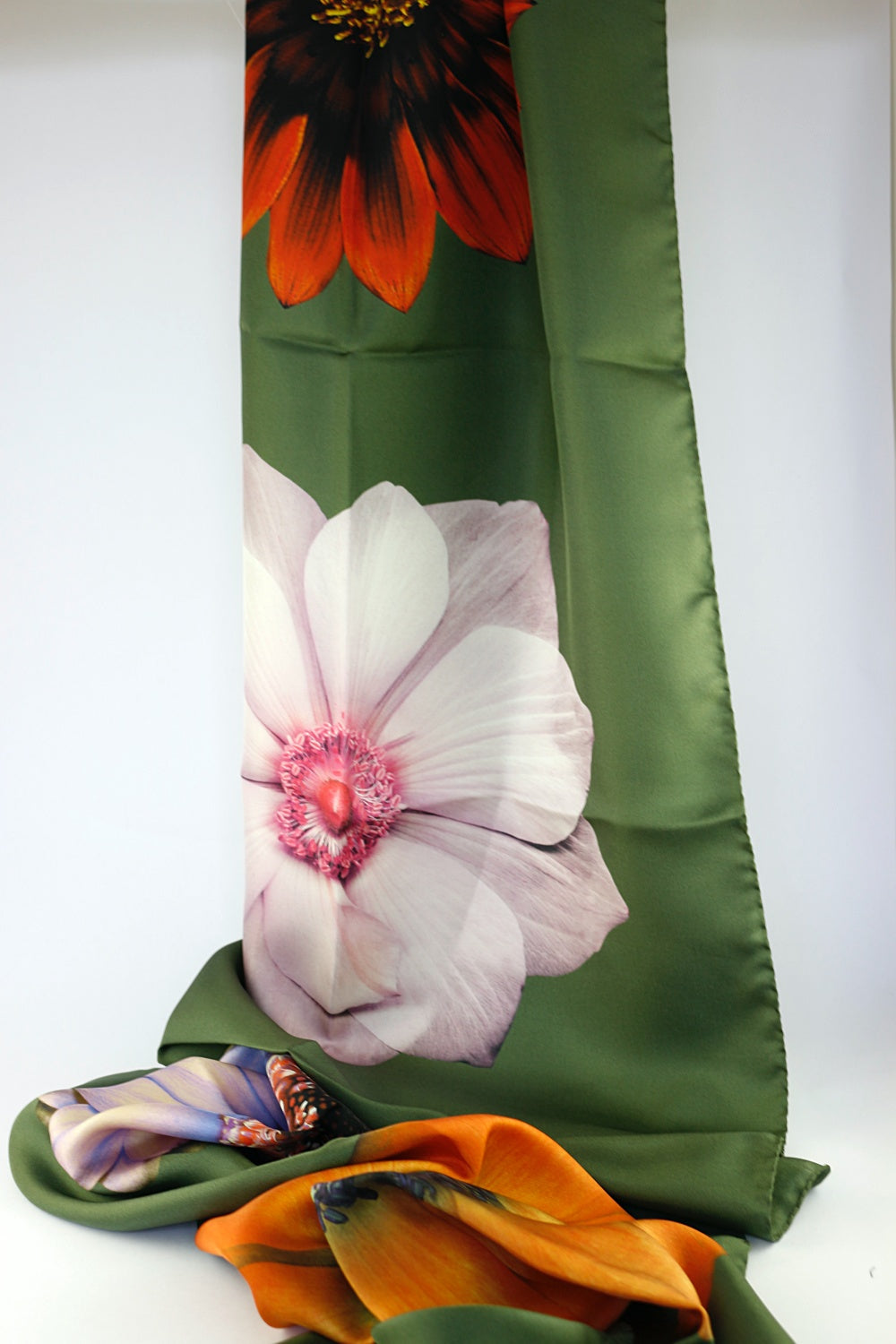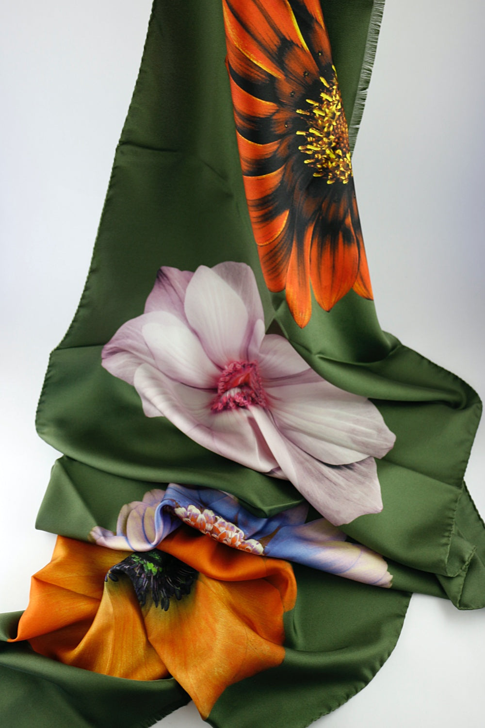The Barbieri 'Luminous Flower' is a stunning silk twill oblong printed scarf. It has an Olive background with four large flowers in luminescent tones of orange, pink, lilac, mauve and purple.