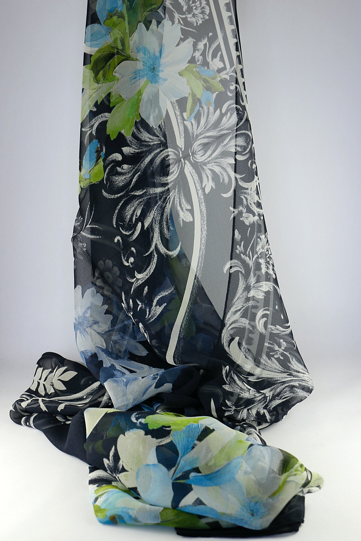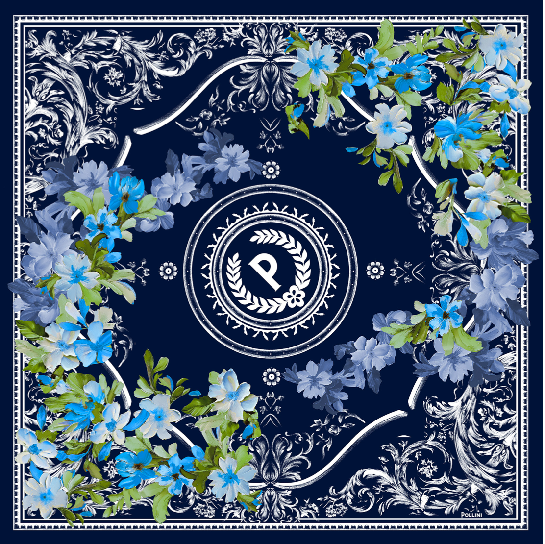 Pollini's 'Flower Fountain' in Dark combines dark blues, mid blues, greens, white and grey in a flowing scene of flowers and swooshes with a structured border.