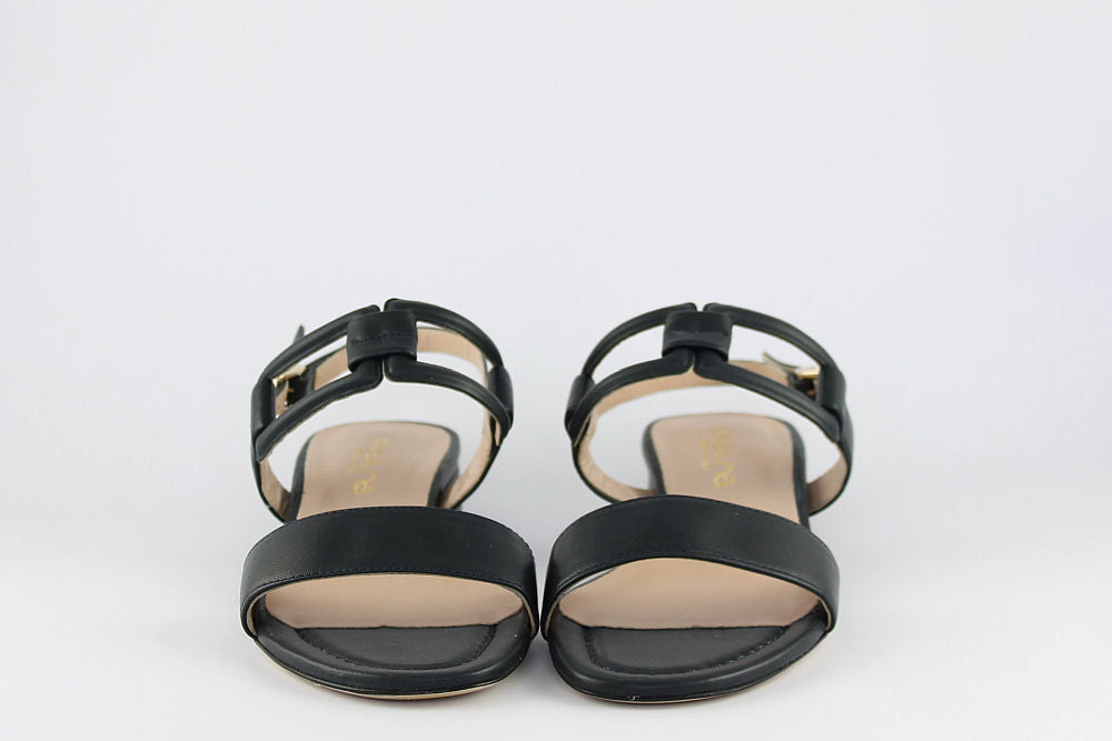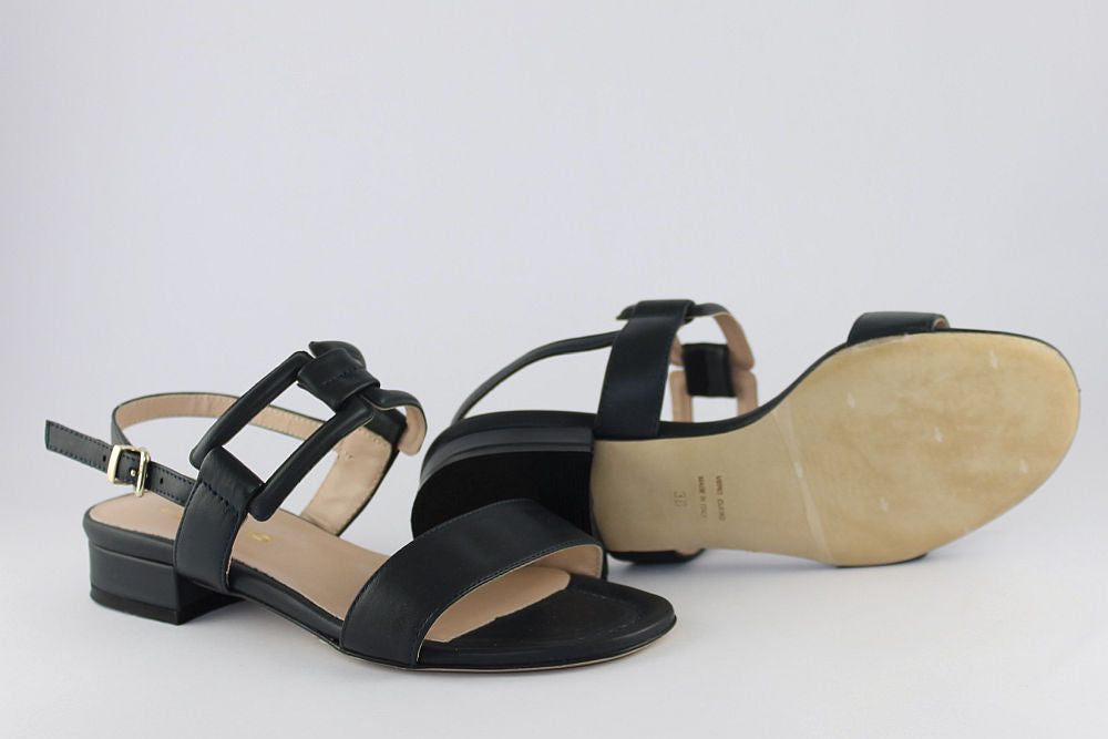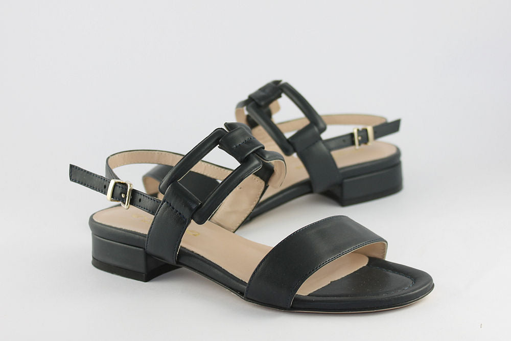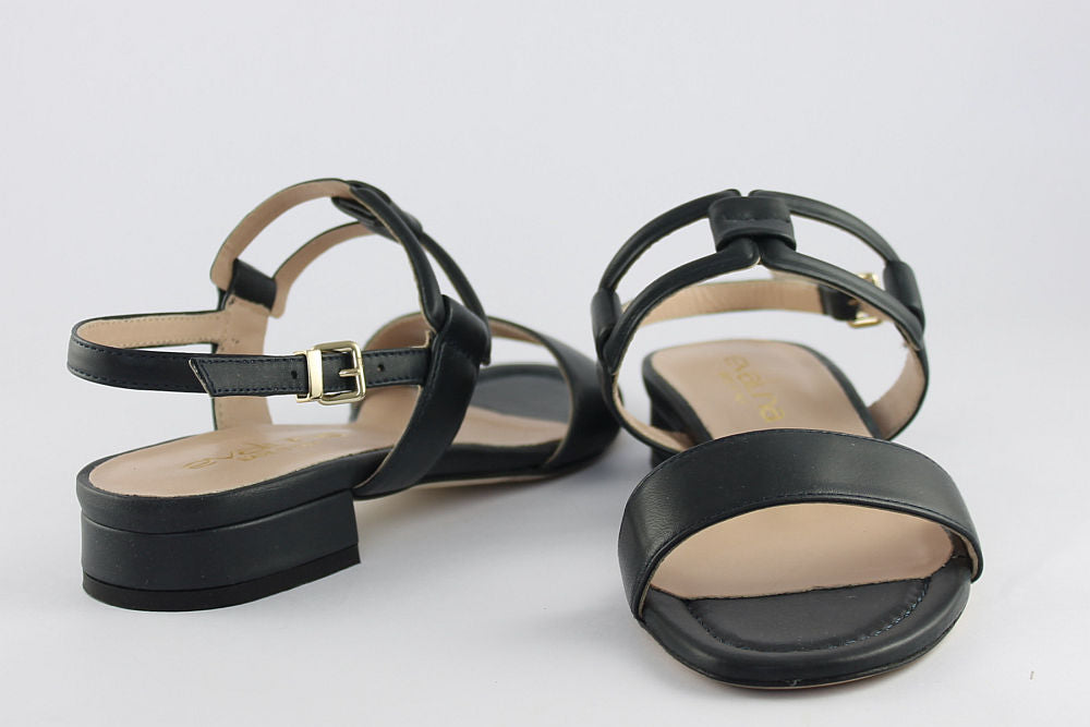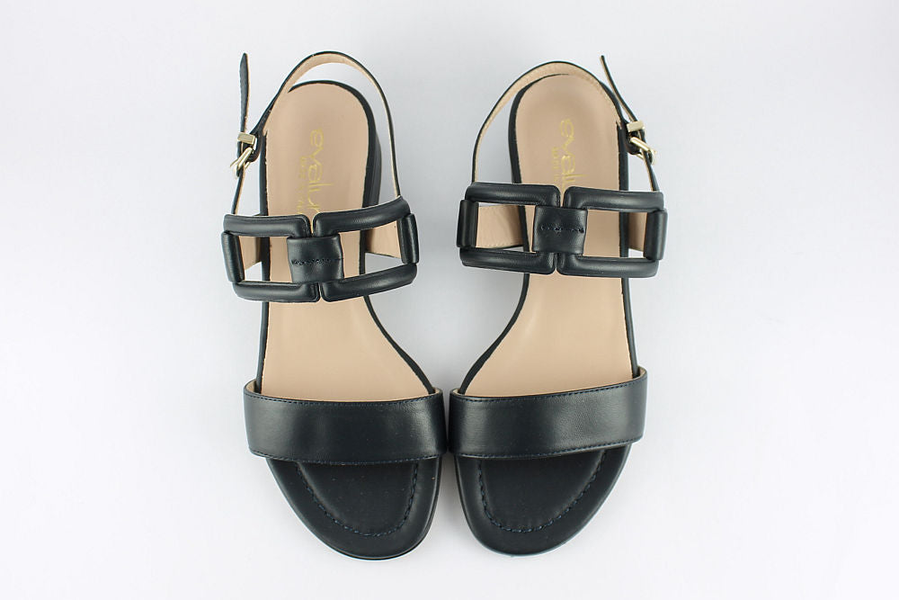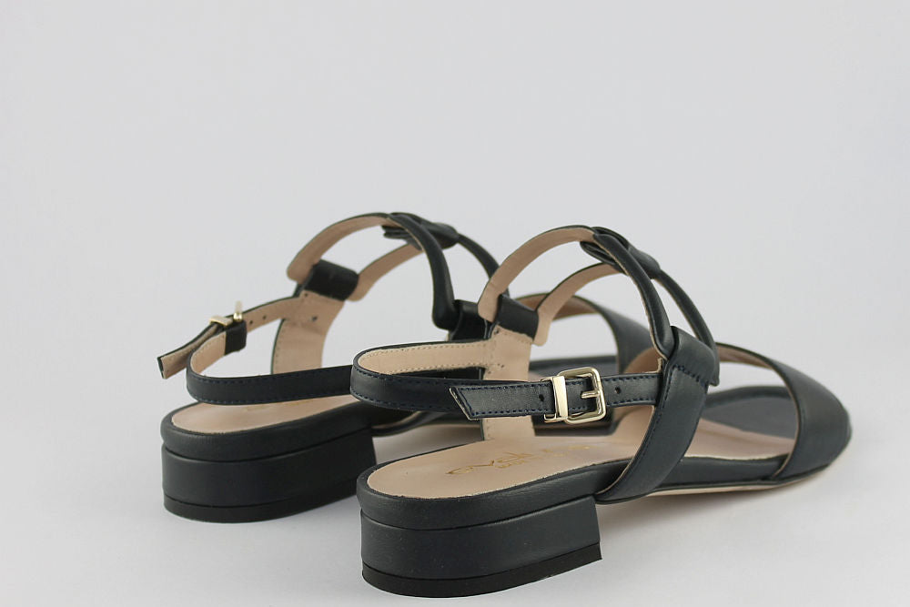 Evaluna 'Palermo' flat leather sandal in dark Navy with an adjustable strap at the back.