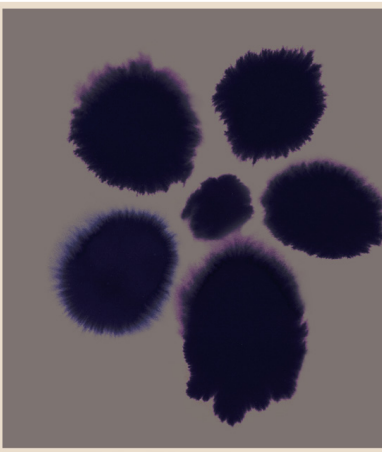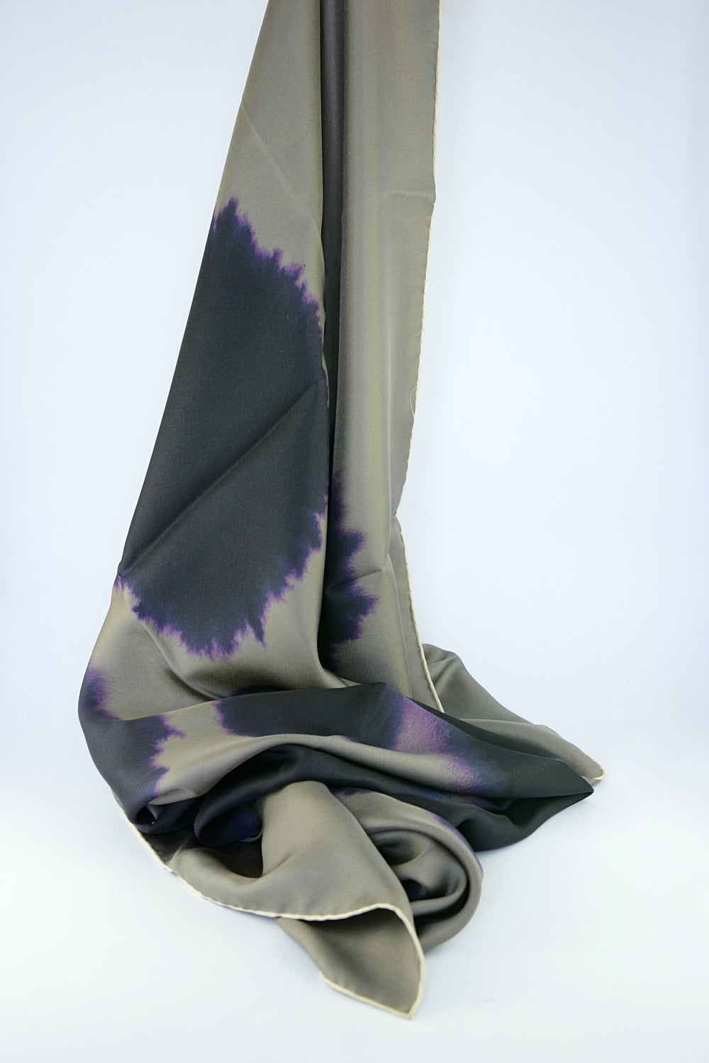 Barbieri 'Silk Splash' has a Pewter (grey) background with bright dark inky splashes of different sizes, shapes and tones in a blue purple hues. Very dramatic.