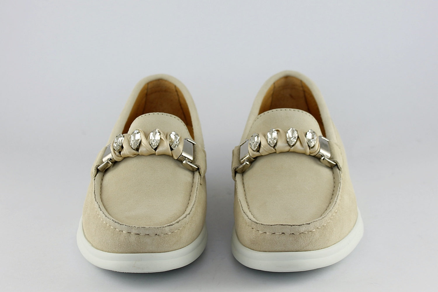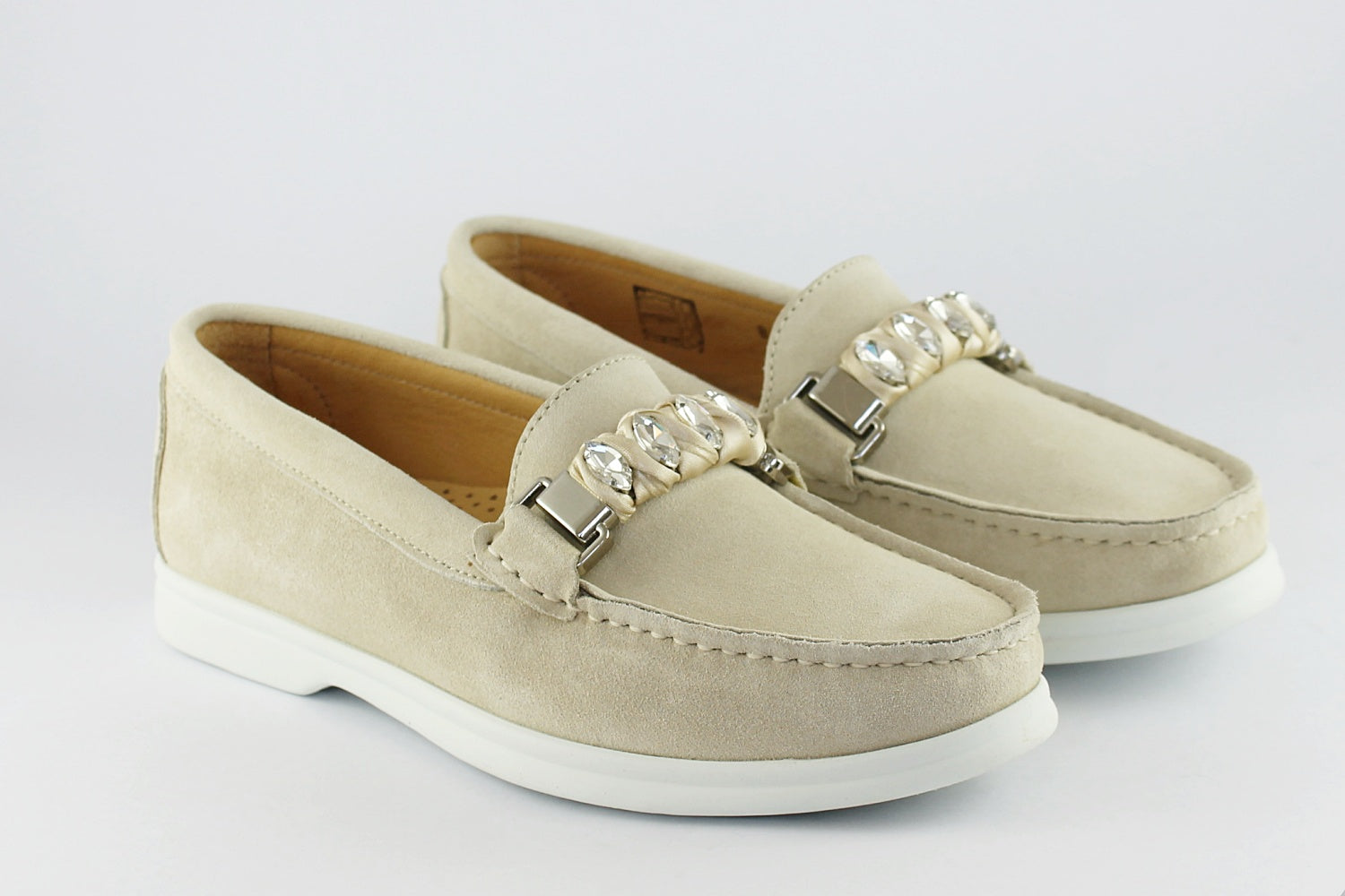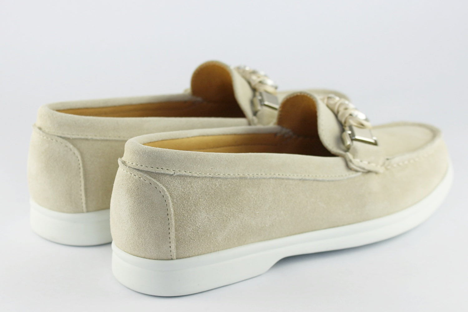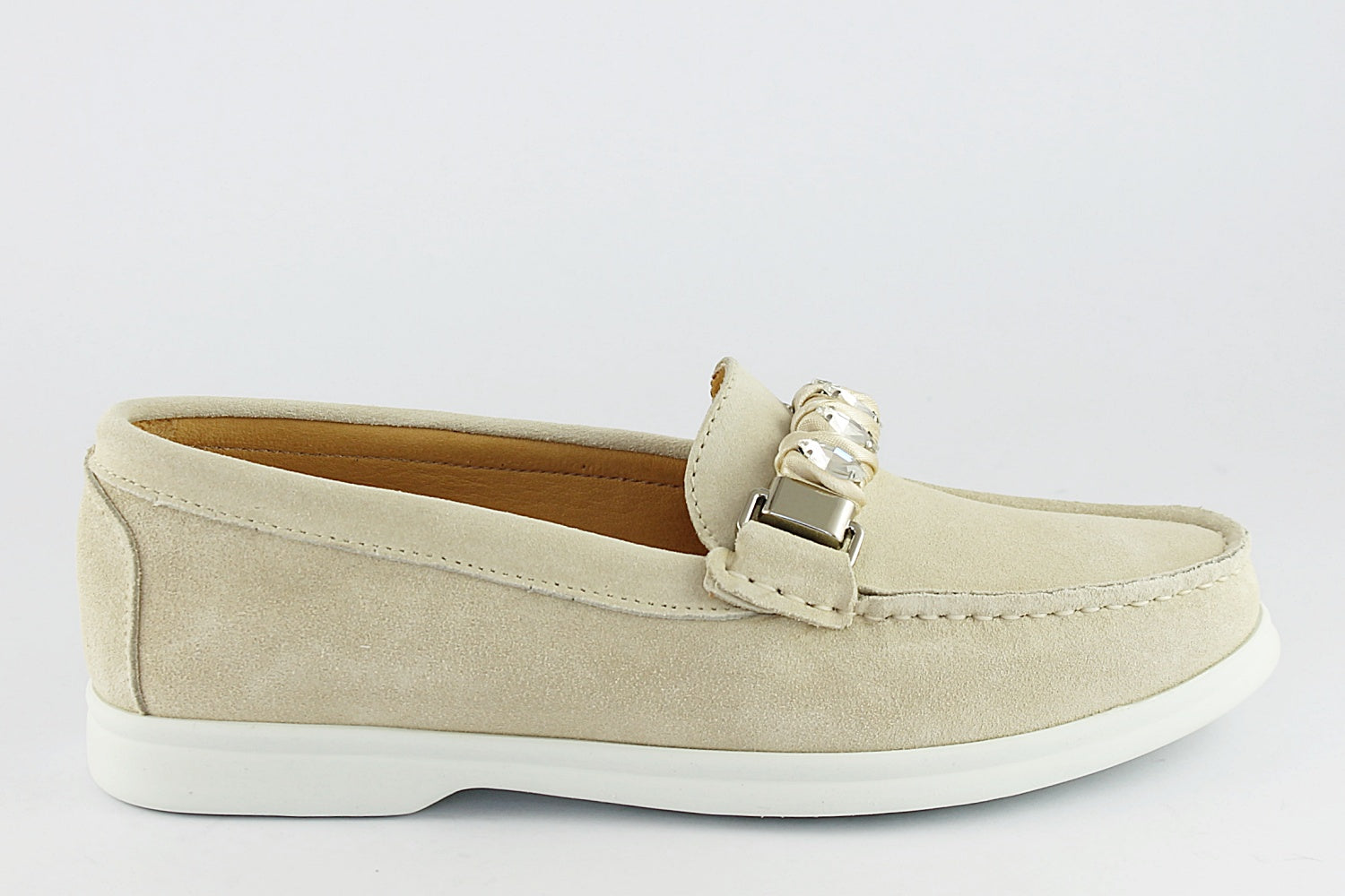 This soft suede loafer has a 'diamond' buckle detail, cushioned leather inners and a white rubber sole.
