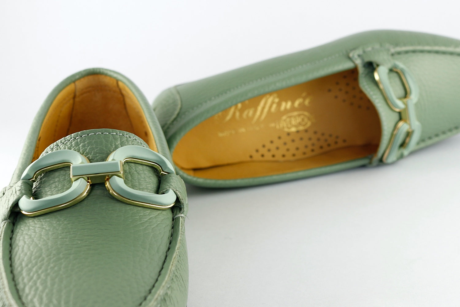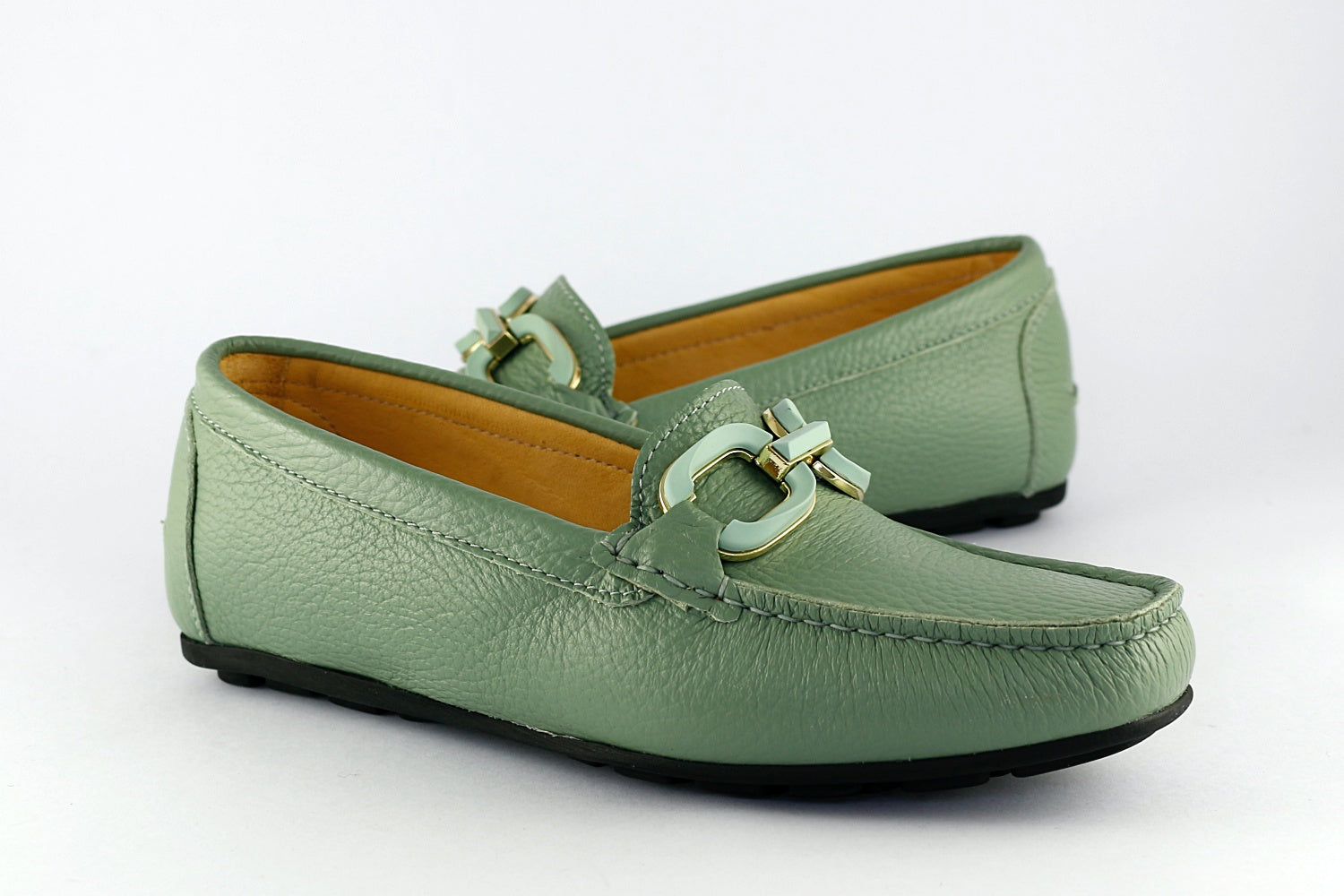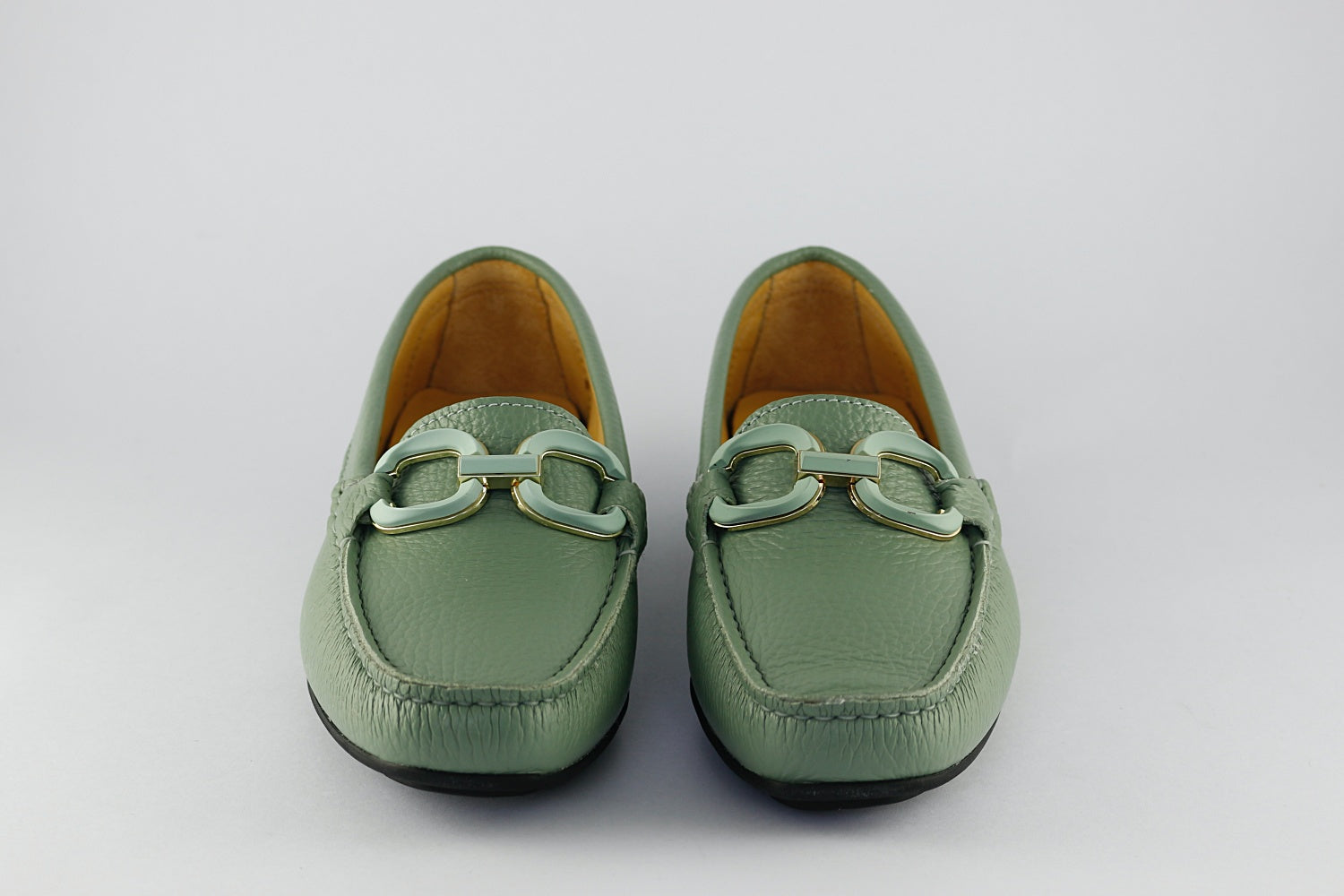 This sage green leather loafer has a with a paler sage buckle detail, edged in a subtle silver. The inner linings are leather and cushioned and it has a rubber, 'hovercraft' sole.