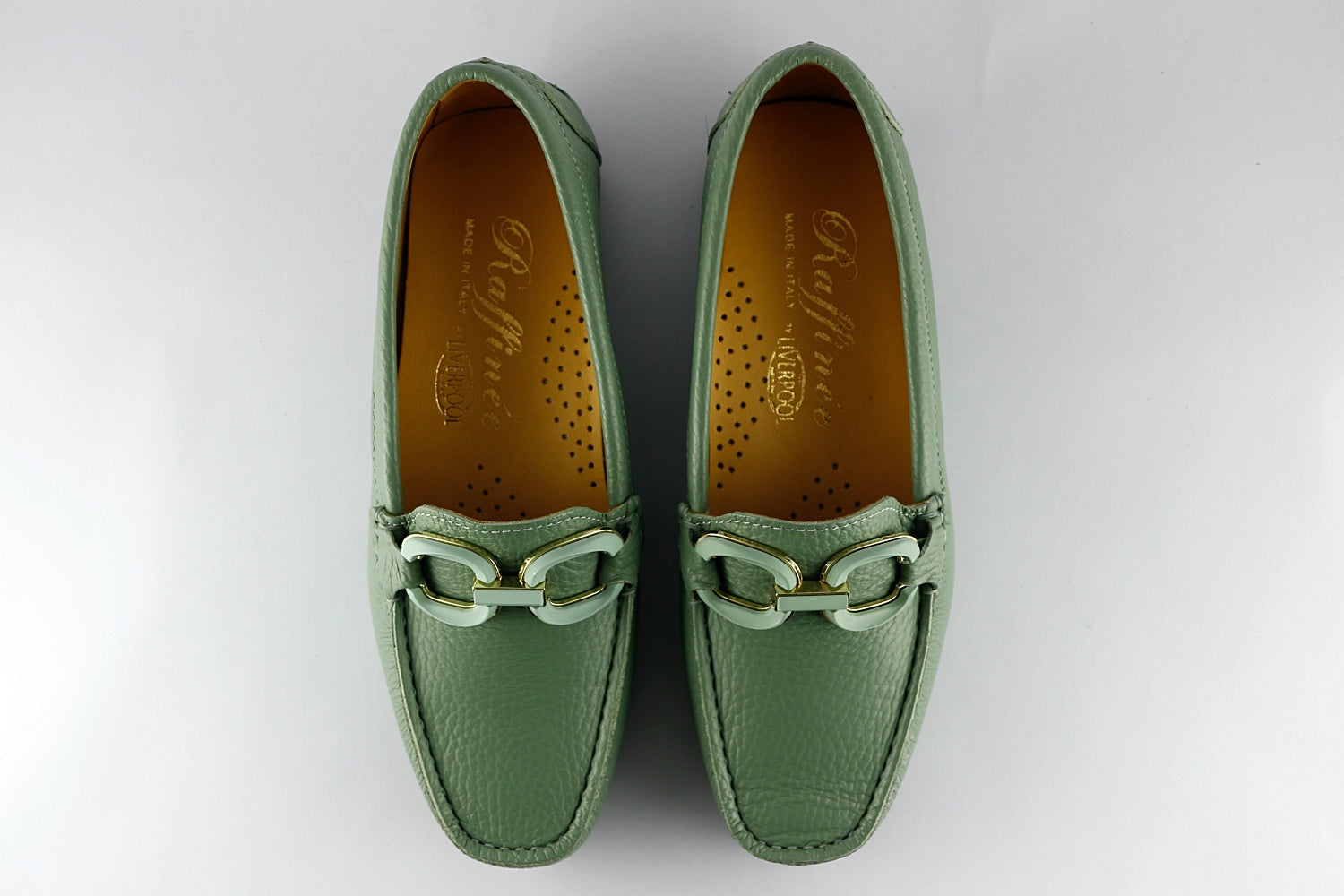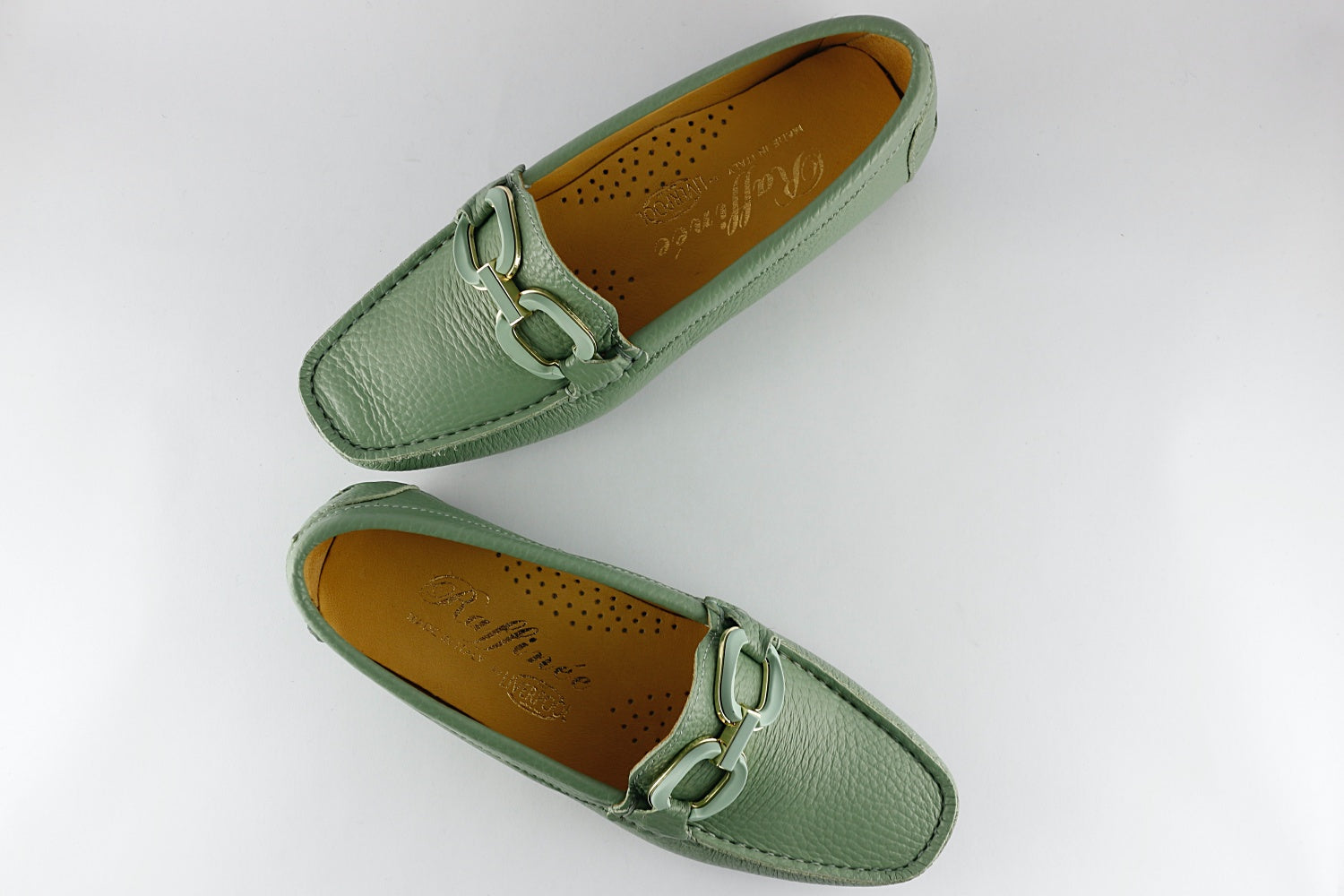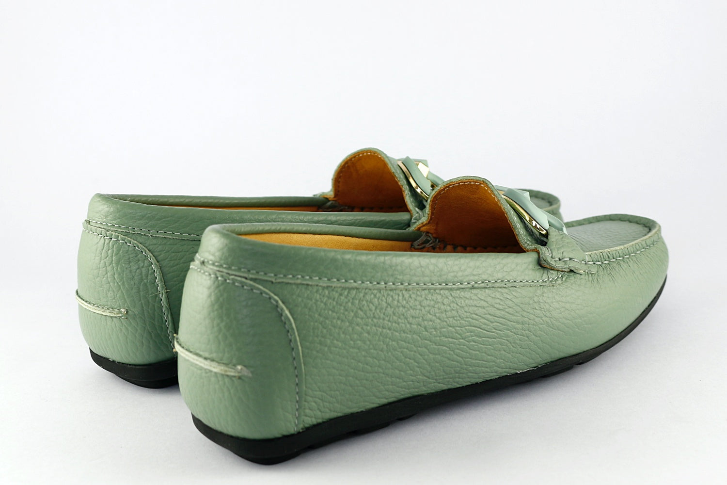 This sage green leather loafer has a with a paler sage buckle detail, edged in a subtle silver. The inner linings are leather and cushioned and it has a rubber, 'hovercraft' sole.