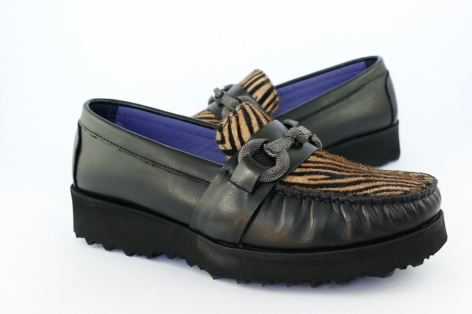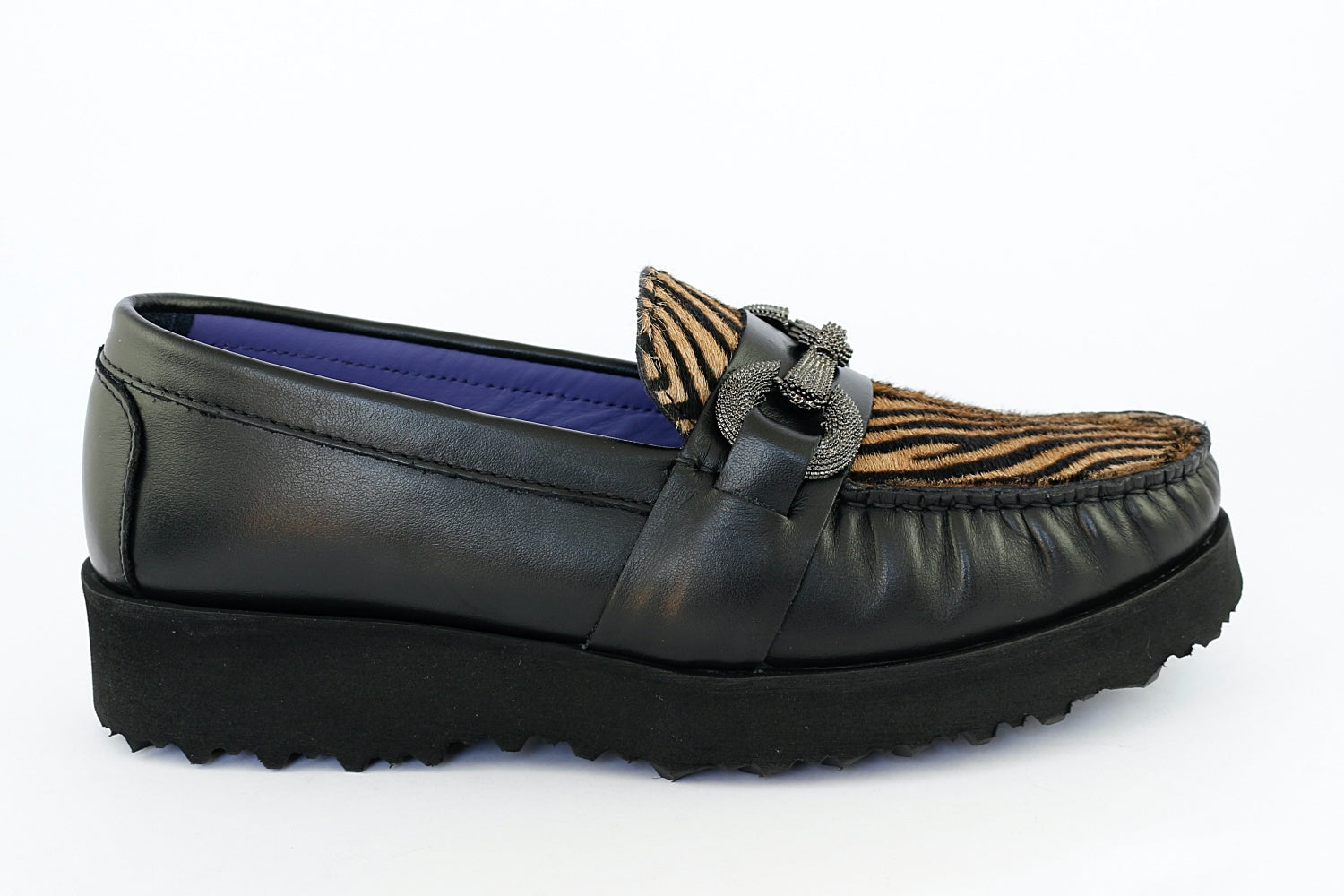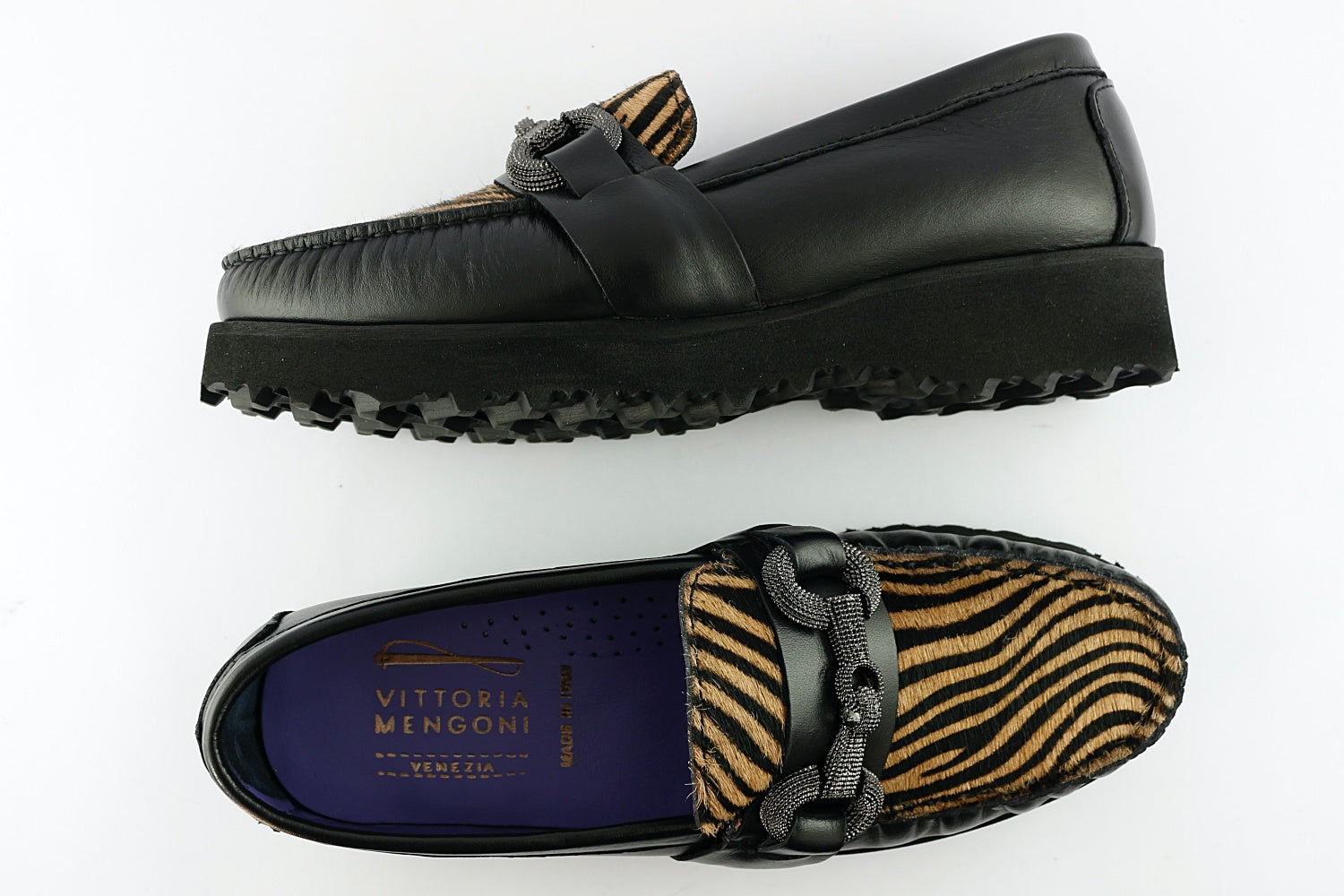 Vittoria Mengoni's 'Sira' is a black leather loafer on a wedge with a 'zebra' design in pony. This is elevated by a black leather strip and a sparkly silver snaffle. We have said 'zebra' due to the pattern, rather than the colouring, which is brown/black. Leather-lined, rubber soles.